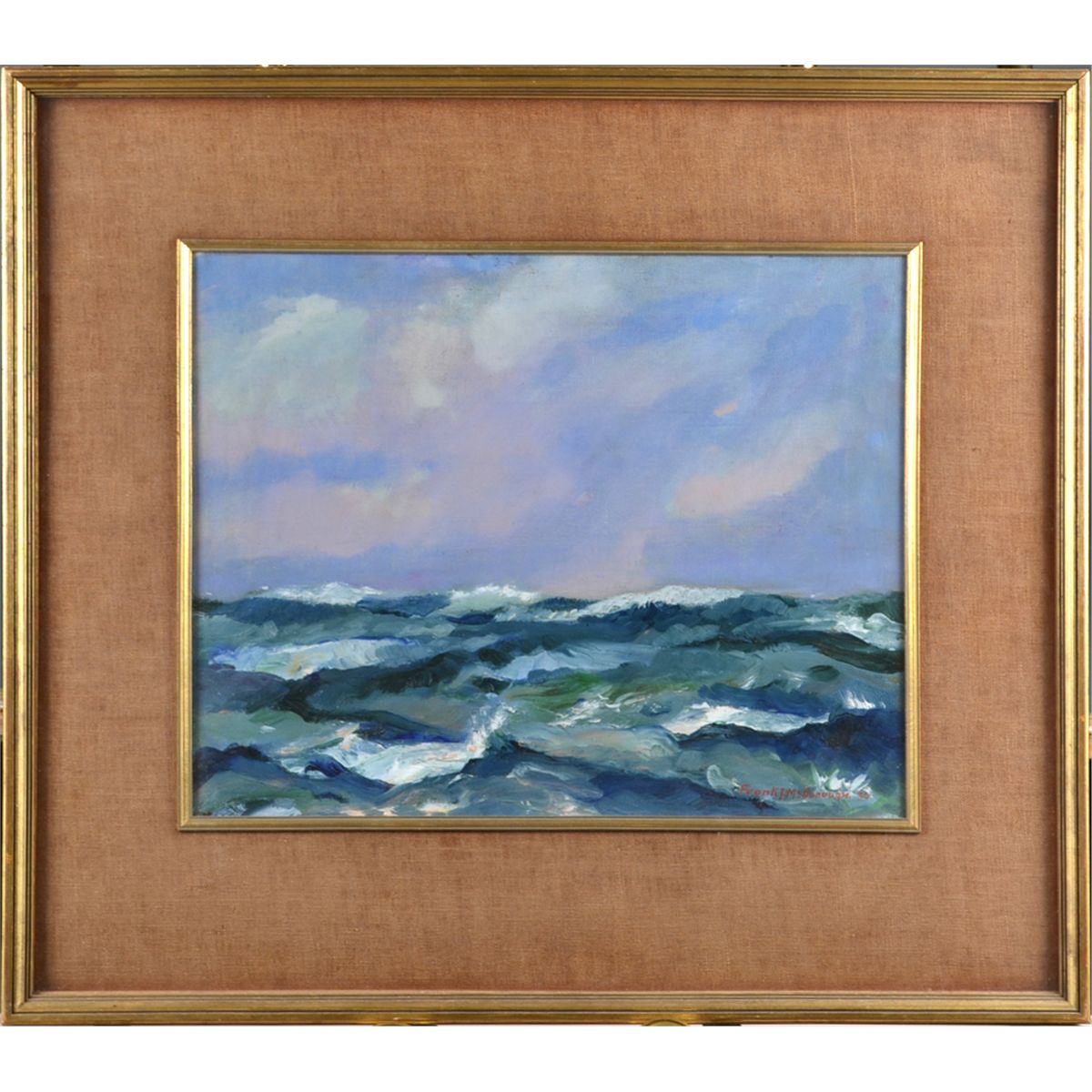 Depicting a seascape in rough sea.  A very strong image of expressionism and emotion with a soft moody sky of lavender, grays and blue.  Signed in LR in red.  Frank McDonough (20th C.), United States is known for his seascape paintings.  Matted with linen liner, in a gold tone wood frame with reeded style, and behind glass.  14.75" H x 18.75" W, sight, 25" H x 28.5" W, framed.  Private collection Troy, MI.