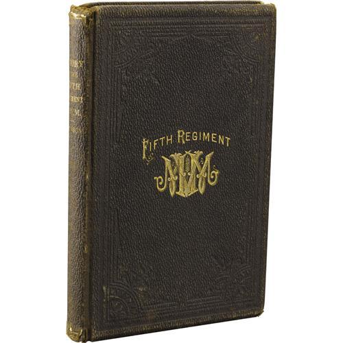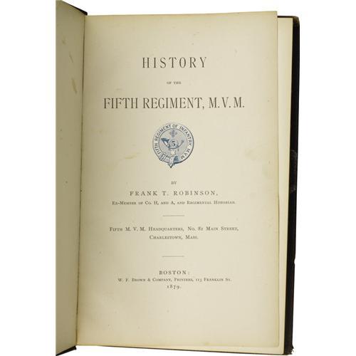 <B>Frank T. Robinson: <I>History of the Fifth Regiment, M.V.M.</B></I>.</B></I> (Boston: W.F. Brown & Company, 1879), first edition, 237 pages plus Errata, textured brown cloth with blind-stamped decoration on the boards and gilt lettering and decoration on the spine and front board, 8vo (6” x 9”), no dust jacket. The book presented here is in good condition, with lightly rubbed boards and noticeable wear to the corners, edges, and spine. Front hinge starting, but the textblock is largely clean.<BR><BR><b>Shipping:</b> Books & Catalogs (<a target="_blank" href="http://www.heritageauctions.com/common/shipping.php">view shipping information</a>)