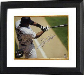 Frank Thomas was a designated hitter and first baseman and became one of baseball's biggest stars in the 1990s. Broadcaster Ken Harrelson nicknamed Thomas "The Big Hurt" in the 1992 season. Thomas was known for his menacing home run power. He is a five-time All-Star (1993, 1994, 1995, 1996, 1997), four-time Silver Slugger Award winner (1991, 1993, 1994, 2000), and two-time AL MVP (1993, 1994). He won the AL batting title in 1997, was named AL Comeback Player of the Year in 2000. He was elected to the Baseball Hall of Fame on the first ballot possible, when he became eligible on January 8, 2014. Frank Thomas has hand signed this Chicago White Sox Color 16x20 Photo. Leaf Authentics Hologram and Certificate of Authenticity from Athlon Sports. Custom White Mat and Premium Black Frame as shown.