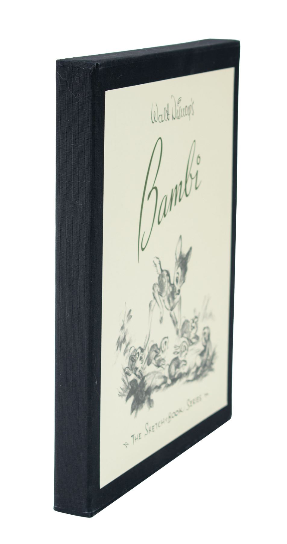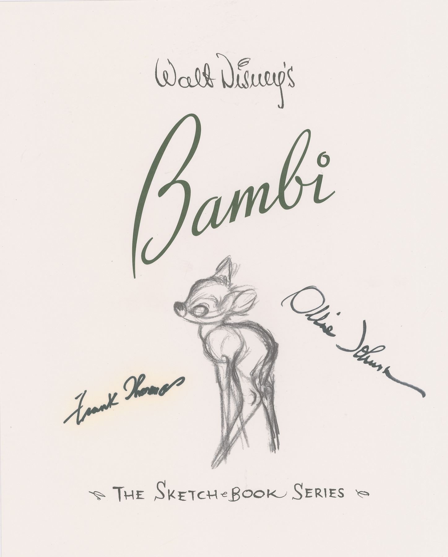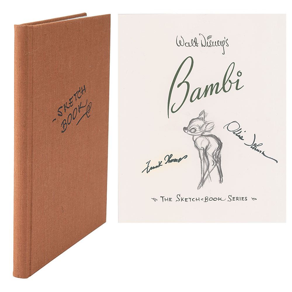 Signed book: Walt Disney's Bambi: The Sketch Book Series. First edition, limited issue, numbered 68/3000. Bedford, MA: Applewood Books, 1997. Hardcover with slipcase, 9.5 x 11.75. Signed on a loosely laid-in print in black felt tip by Frank Thomas and Ollie Johnston. In fine condition, with slight haloing to Thomas's signature. A handsome deluxe volume, compiling sketches and color studies done for the production of the beloved Disney film.