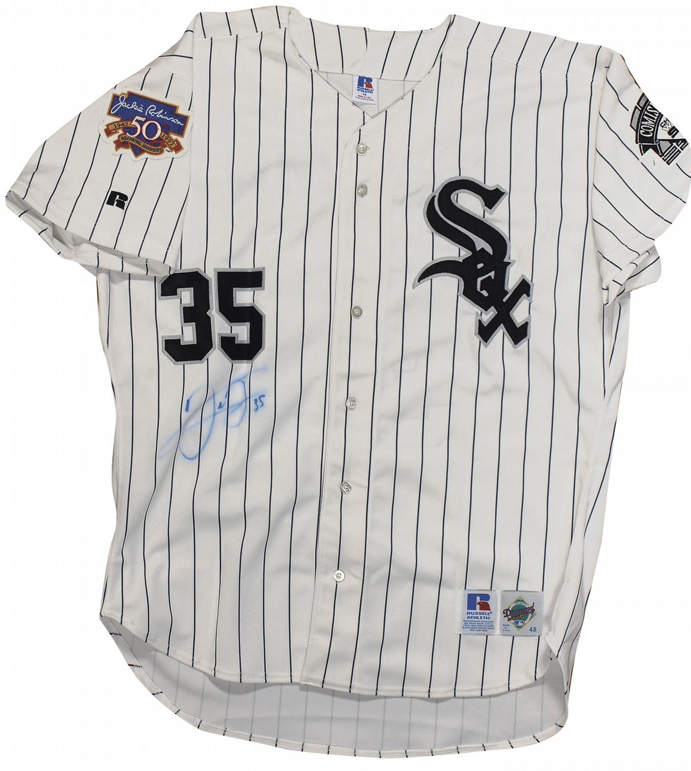 Official Russell replica baseball jersey, with sewn on letters and numbers, signed in blue felt tip on the front. In very good condition, with light haloing and spreading to signature. Accompanied by a certificate of authenticity from Score Board.