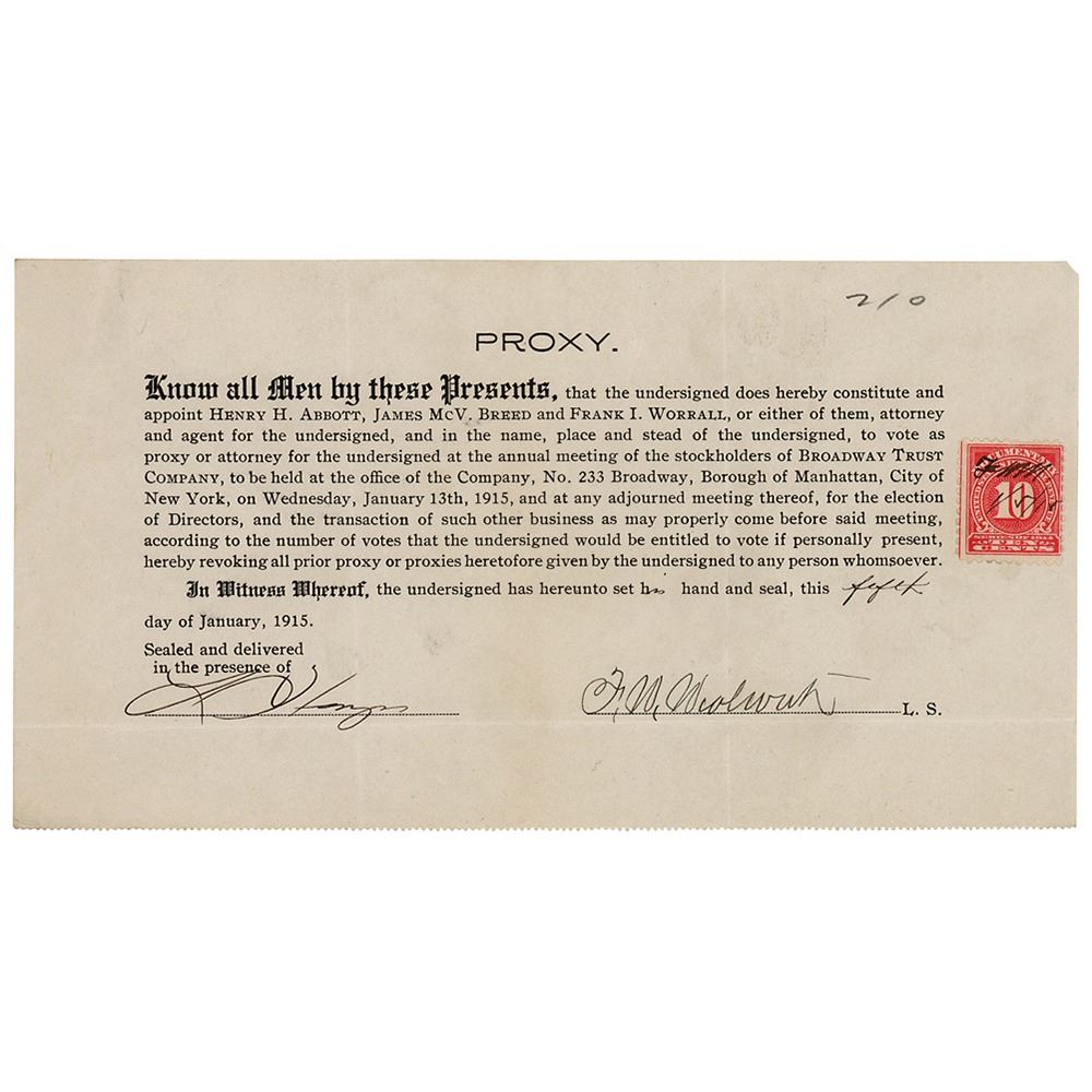DS, signed “F. W. Woolworth,†one page, 8.5 x 4.5, January 5, 1915. Document by which Woolworth appoints "Henry H. Abbott, James McV. Breed and Frank I. Worrall, or either of them, attorney and agent…to voted as proxy or attorney for the undersigned at the annual meeting of the stockholders of Broadway Trust Company." In fine condition.