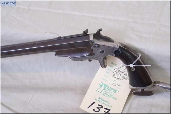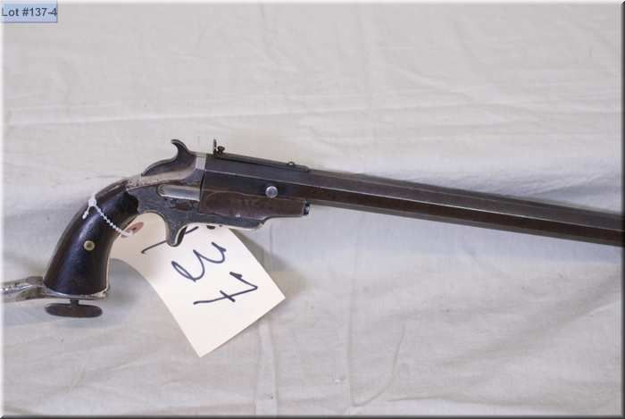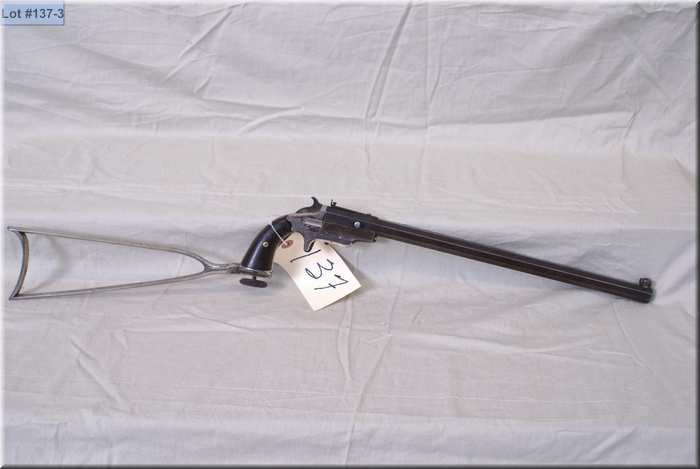 Frank Wesson mod 1870 Pocket Rifle, .32 Rimfire cal Single Shot Roll Over Breech Pistol, w/15" Oct bbl [fading blue on bbl, flaking nickel finish on spur trigger frame and grip strap, has matching numbered detachable nickel skeleton style framed shoulder stock, also starting to flake, good Rosewood grips, has extractor that slides in a dove tail on right side of the barrel, w/external push button half cock mounted on the left side of the frame ] Ser # 78 Antique NO FAC REQ HG