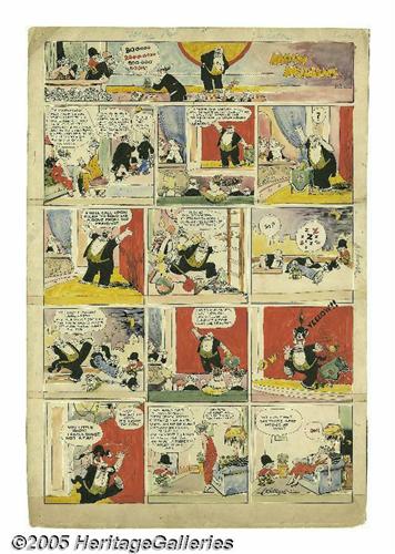 <B>Frank Willard - Moon Mullins Hand Colored Sunday Comic Strip Original Art, dated 5-18-24 (Chicago Tribune, 1924).</B></I> Lord Plushbottom finally has his big vaudeville audition, but Moon messes things up -- as usual. Frank Willard had been drawing a strip called <I>The Outta Luck Club</B></I> for King Features when he was fired after an altercation with George McManus (of <I>Bringing Up Father</B></I> fame); he quickly moved over to the Chicago Tribune Syndicate, where head honcho Captain Joe Patterson had been contemplating a strip about a tough guy. Willard's <I>Moon Mullins</B></I> debuted from Patterson's syndicate on June 19, 1923. This is a splendid Sunday from the only the second year of the series, which has been hand-colored with vibrant hues. The image area measures 16.5" x 25", and the art is in Good condition. The piece has been assembled from four tiers glued to a common backing board, seemingly to extend the bottom portion of each panel.