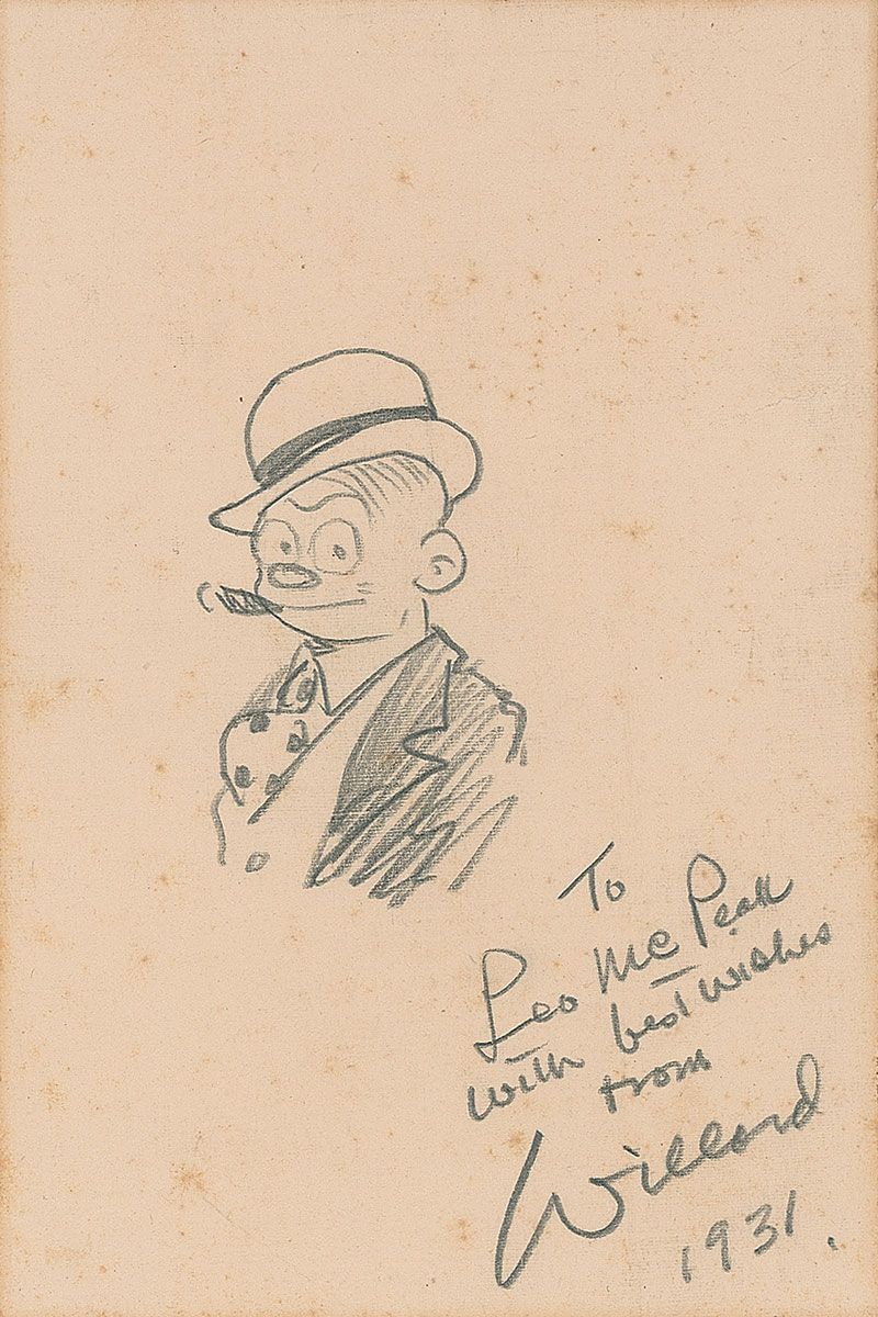 Cartoonist (1893–1958) and creator of Moon Mullins, regarded as one of the greatest comic strips of all time. Original vintage signed and inscribed pencil sketch of Moon Mullins on an off-white 3.25 x 5 card, signed and inscribed, “To Leo McPeak, with best wishes from Willlard, 1931.” In fine condition, with a bit of scattered light foxing and a small crease to right edge.