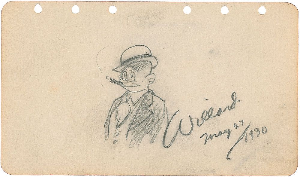 Original vintage signed pencil sketch of Moon Mullins on an off-white 6 x 3.5 album page, signed in pencil, “Willard, May 27, 1930.” In fine condition, with some light brushing to graphite.