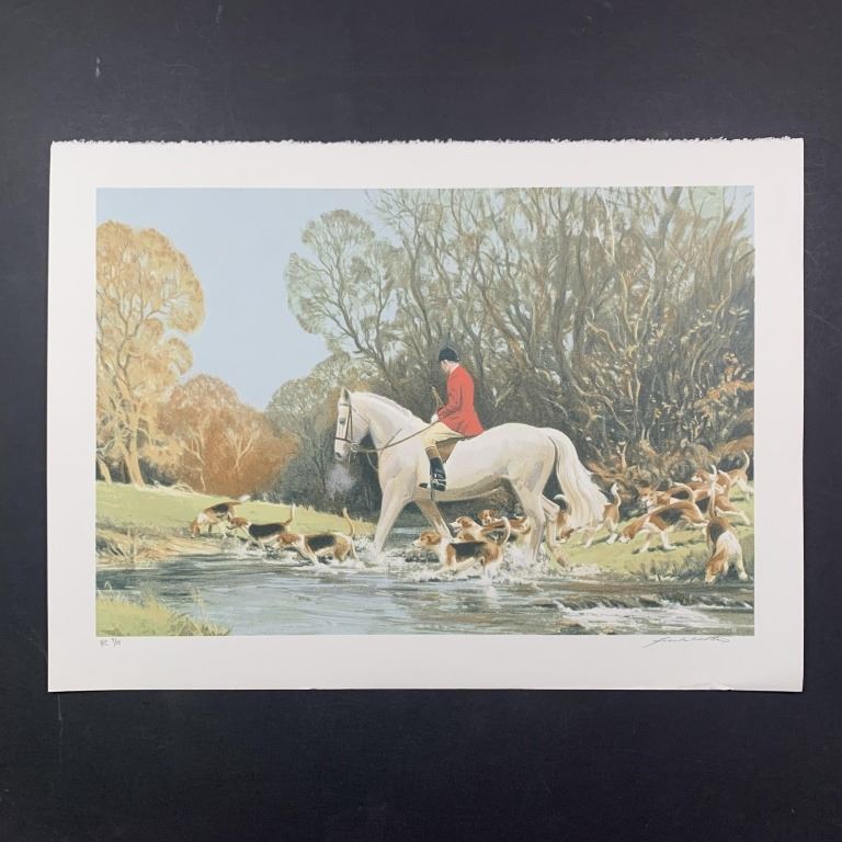 Frank Wootton's "Huntsman Crossing Stream" limited edition print, signed lower right and numbered HC 7/15 lower left. This piece is of a huntsman on a white horse, crossing asmall stream with a pack of hunting dogs. This piece is in near excellent condition with small wrinkle lower right.