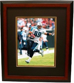 Frank Wycheck's stellar performance on the field with the Tennessee Titans and visibility in the media helped him become one of the most popular players on the team. Wycheck amassed 505 receptions for 5,126 yards and 28 touchdowns over his 11-year career, one of only five tight ends to surpass 500 receptions in NFL history. Wycheck led the Titans in receiving for three consecutive seasons (1999–2001). He also made the Pro Bowl in 1998, 1999 and 2000. Wycheck is perhaps most famous for his particiption in the Music City Miracle, where, with the Titans down 16-15 with 16 seconds remaining, to the Buffalo Bills in the wild card round of the playoffs in 2000, after taking a handoff from Lorenzo Neal, he lateraled the ball to Kevin Dyson, who turned the ball upfield 75 yards for the game winning touchdown. This is a color unautographed 8x10 Photo of Tennessee Titans Superstar Tight-End Frank Wycheck. Black Mat and Wood Color Framed as shown.