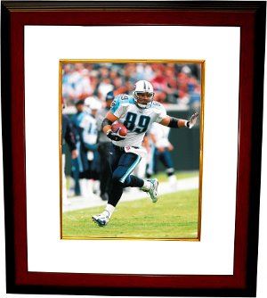 Frank Wycheck's stellar performance on the field with the Tennessee Titans and visibility in the media helped him become one of the most popular players on the team. Wycheck amassed 505 receptions for 5,126 yards and 28 touchdowns over his 11-year career, one of only five tight ends to surpass 500 receptions in NFL history. Wycheck led the Titans in receiving for three consecutive seasons (1999–2001). He also made the Pro Bowl in 1998, 1999 and 2000. Wycheck is perhaps most famous for his particiption in the Music City Miracle, where, with the Titans down 16-15 with 16 seconds remaining, to the Buffalo Bills in the wild card round of the playoffs in 2000, after taking a handoff from Lorenzo Neal, he lateraled the ball to Kevin Dyson, who turned the ball upfield 75 yards for the game winning touchdown. This is a color unautographed 8x10 Photo of Tennessee Titans Superstar Tight-End Frank Wycheck. White Mat and Wood Color Framed as shown.