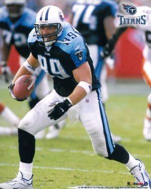 Frank Wycheck\'s stellar performance on the field with the Tennessee Titans and visibility in the media helped him become one of the most popular players on the team. Wycheck amassed 505 receptions for 5,126 yards and 28 touchdowns over his 11-year career, one of only five tight ends to surpass 500 receptions in NFL history. Wycheck led the Titans in receiving for three consecutive seasons (1999–2001). He also made the Pro Bowl in 1998, 1999 and 2000. Wycheck is perhaps most famous for his particiption in the Music City Miracle, where, with the Titans down 16-15 with 16 seconds remaining, to the Buffalo Bills in the wild card round of the playoffs in 2000, after taking a handoff from Lorenzo Neal, he lateraled the ball to Kevin Dyson, who turned the ball upfield 75 yards for the game winning touchdown. This is a color unautographed 8x10 Photo of Tennessee Titans Superstar Tight-End Frank Wycheck.