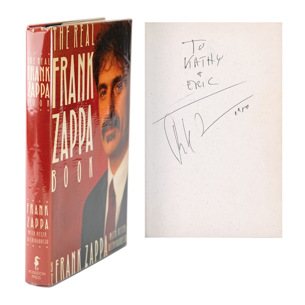 Signed book: The Real Frank Zappa Book. First edition. NY: Poseidon Press, 1989. Hardcover with dust jacket, 6.5 x 9.5, 352 pages. Signed and inscribed on the first free end page in black ballpoint, "To Kathy & Eric, Frank Zappa, 1989." In fine condition.