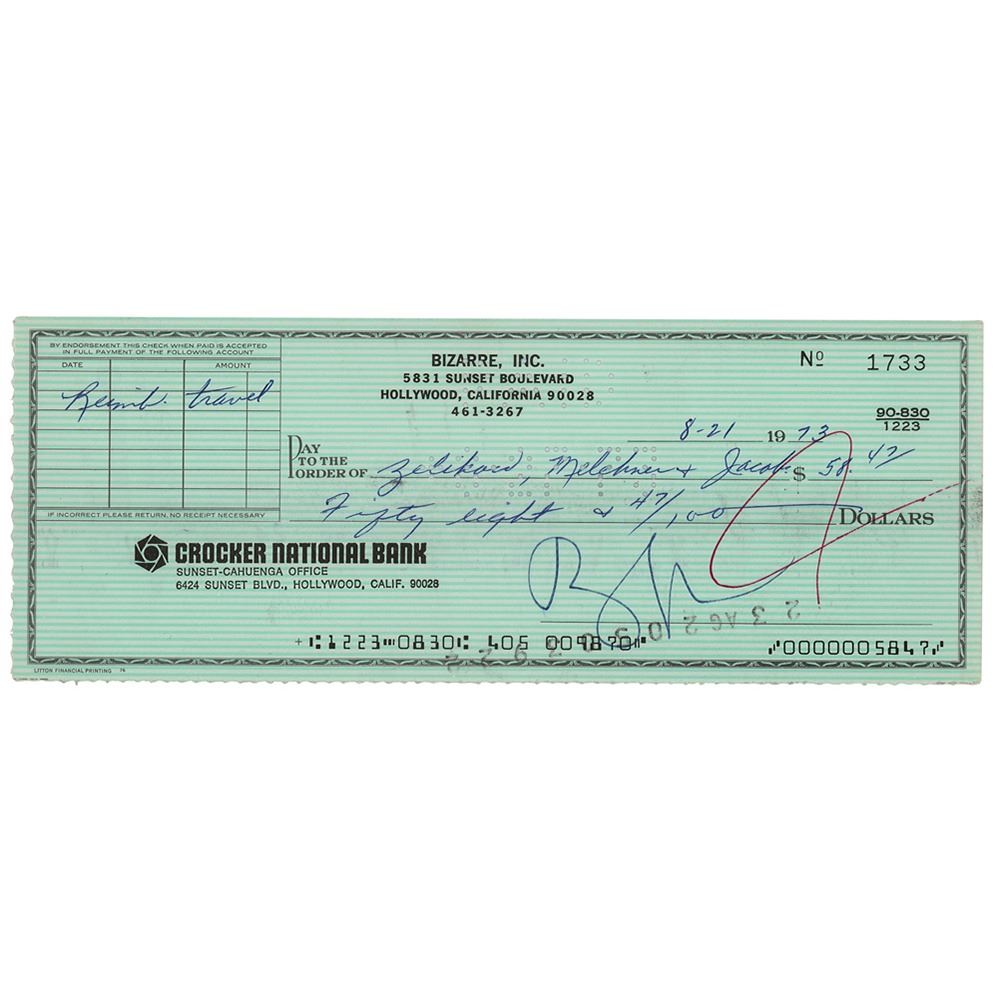 Bizarre, Inc. business check, 8.25 x 3, filled out in another hand and signed by Frank Zappa, payable to Zelikow, Mezchner & Jacobson for $58.42, August 21, 1973. In fine condition. Accompanied by a full letter of authenticity from JSA.