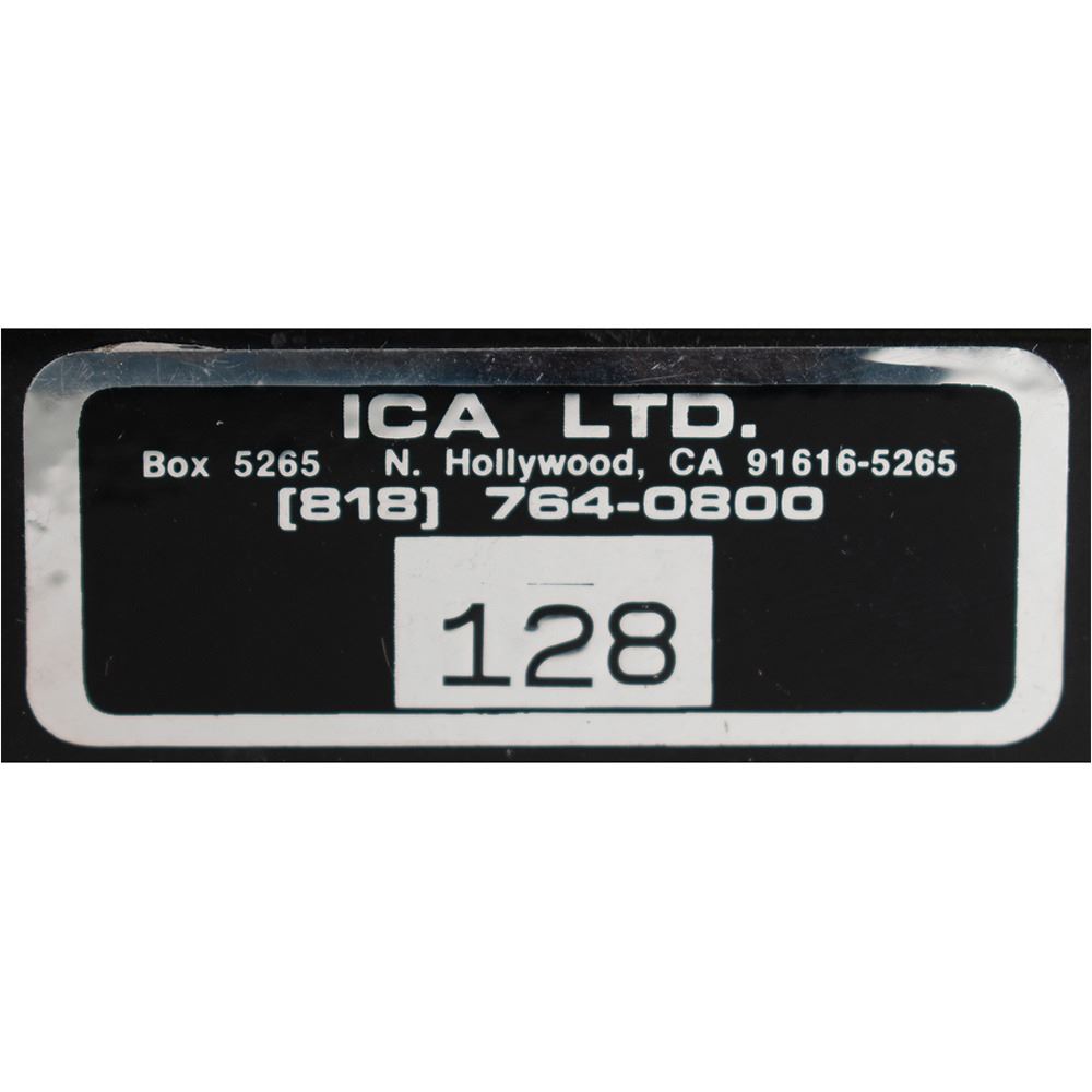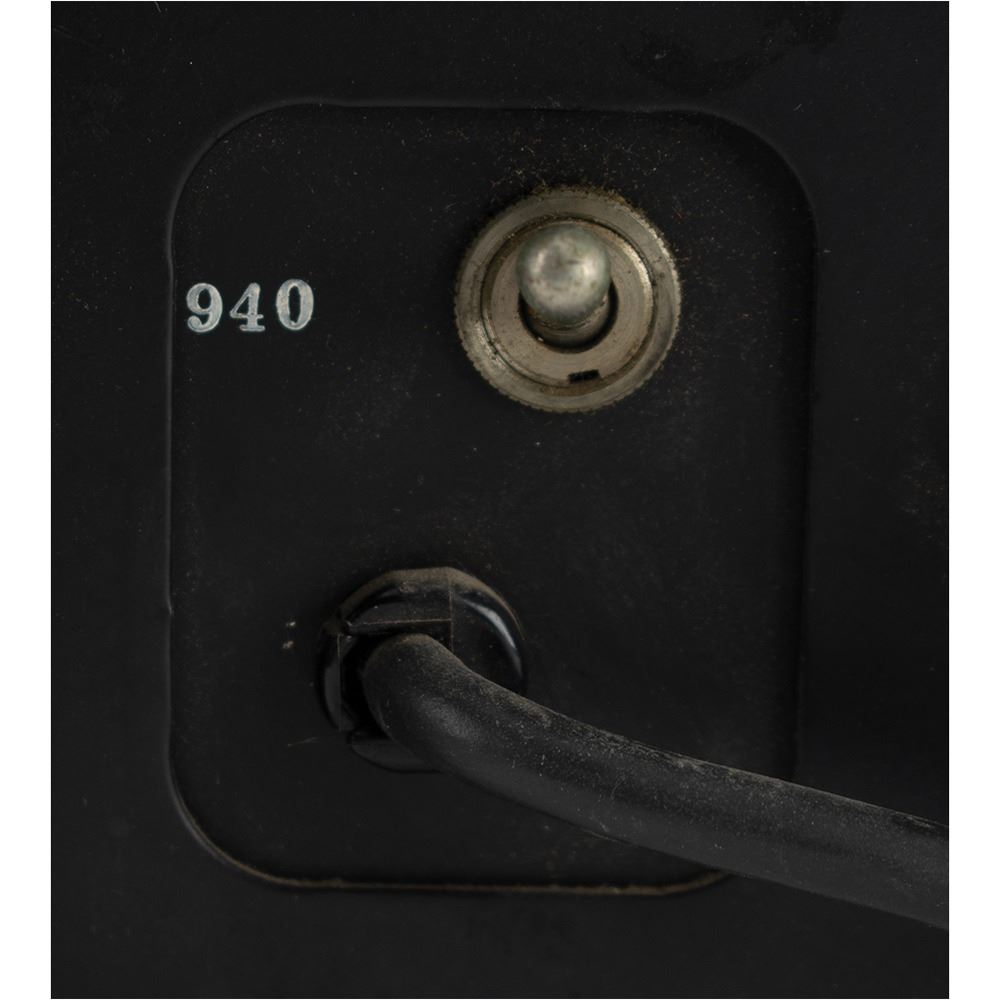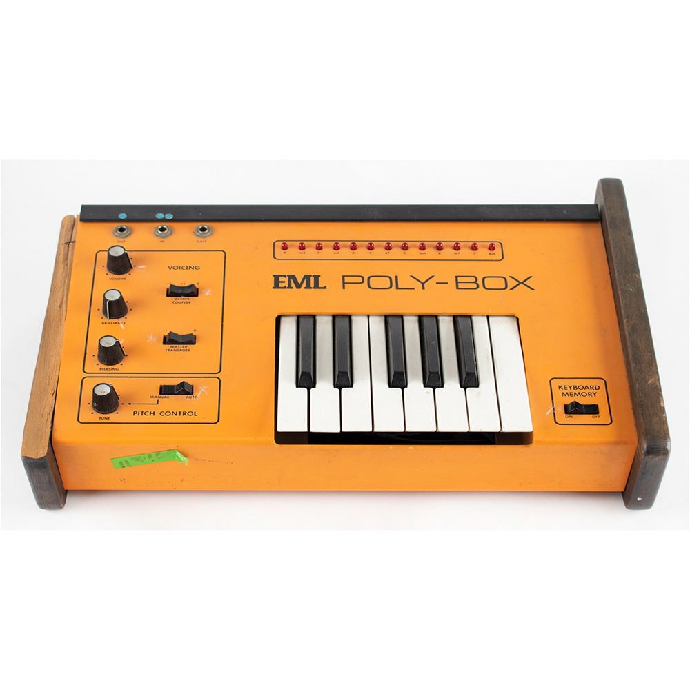 An EML Poly-Box remote analog synthesizer controller from the personal collection of Frank Zappa. The controller weighs approximately 14 lbs and measures 18.5Ë x 12.25Ë x 5.25Ë, and features a miniature keyboard, three input jacks for “Out,†“In,†and “Gate,†switches and knobs for “Voicing,†“Pitch Control,†and “Keyboard Memory,†and red light bulbs for 13 different octaves. Back panel bears an on/off toggle switch (marked “940â€), an ICA Ltd. label numbered “128,†and a “Poly-Box, Electronic Music Laboratories†stamp. In very good to fine, untested condition, with expected signs of use, and a missing upper section of left wooden frame.