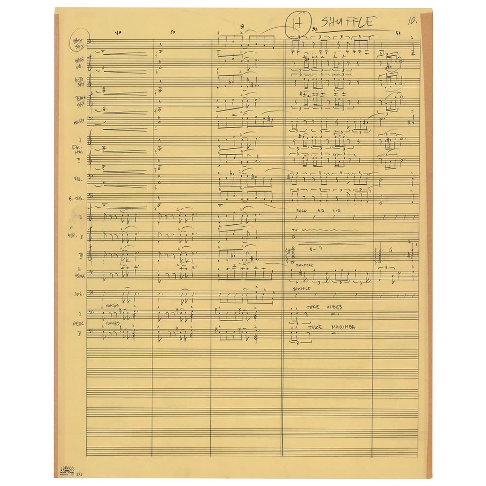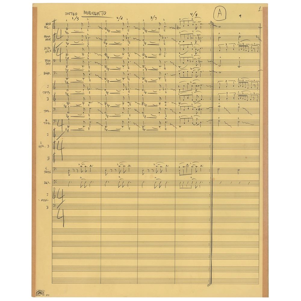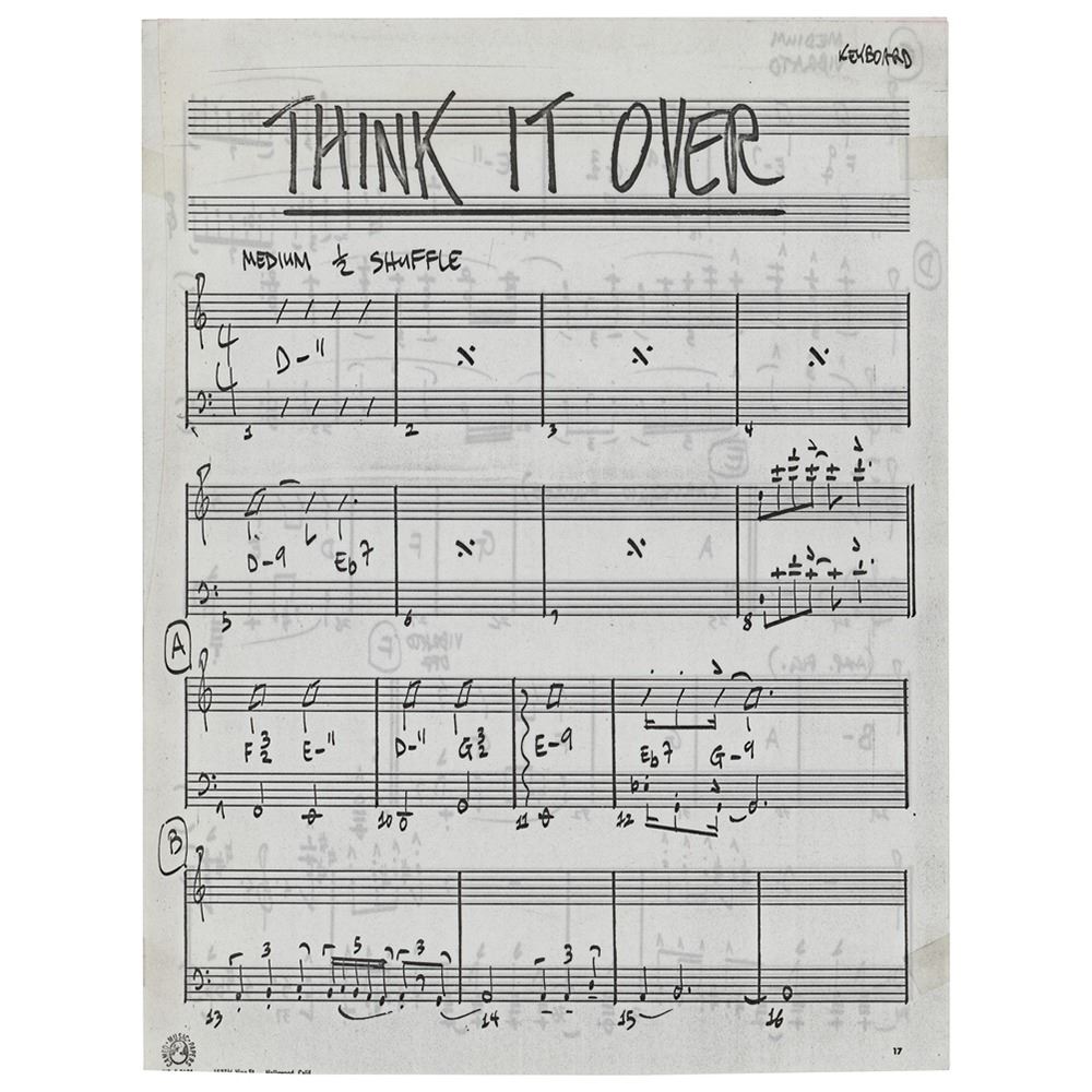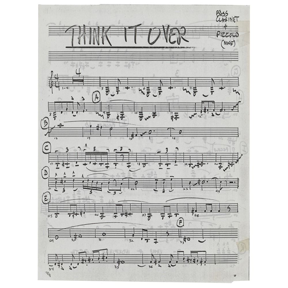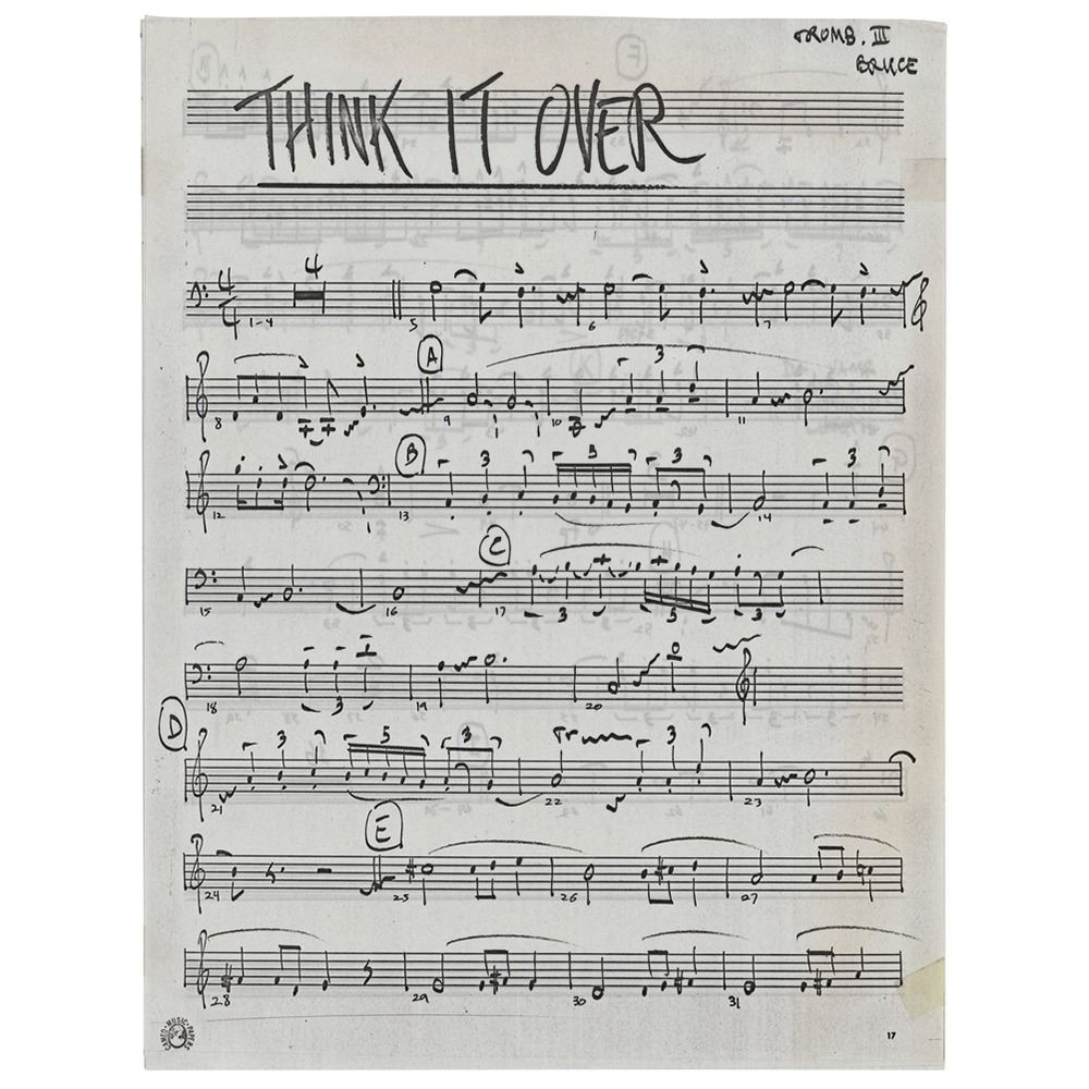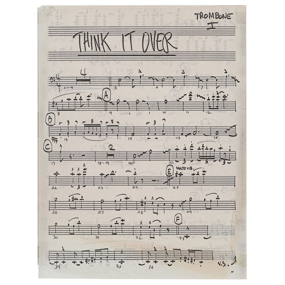 One-of-a-kind original 14-page orchestral arrangement by Frank Zappa for the song ‘Think It Over,’ written as part of the unrealized two-act Broadway stage production Hunchentoot, a science-fiction musical conceived by Zappa while he recovered from his near-fatal attack at the Rainbow Theatre in December 1971. The tape-bound manuscript, 12.25 x 15, is comprised of 14 musically lined sheets that are meticulously and entirely annotated in pencil by Zappa, who incorporates his signature on the cover sheet: “‘Think It Over,’ Part I, Frank Zappa, Concert Pitch Score, Don’t Shoot This Page.â€
