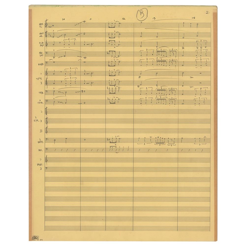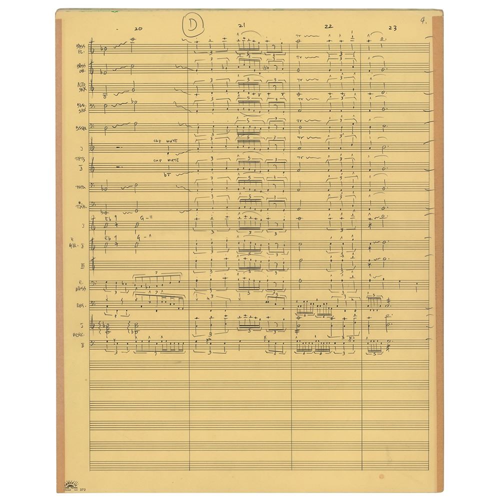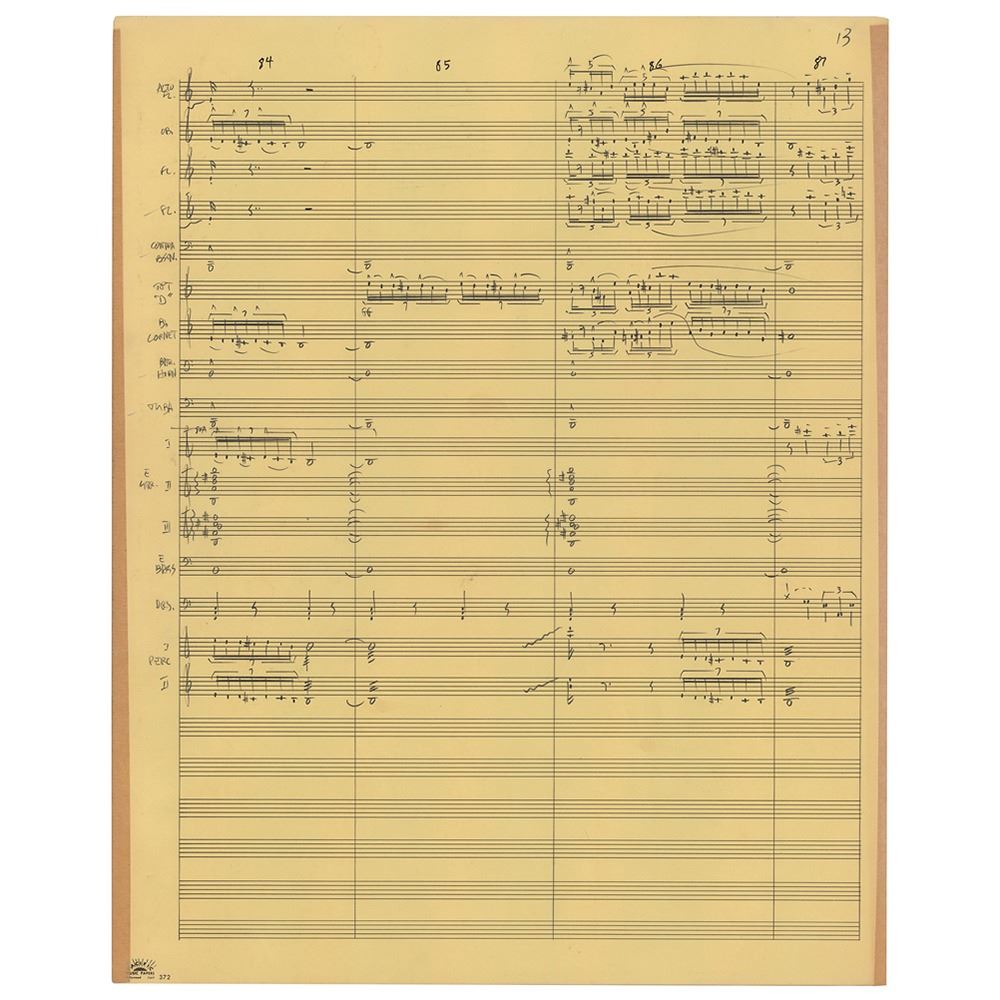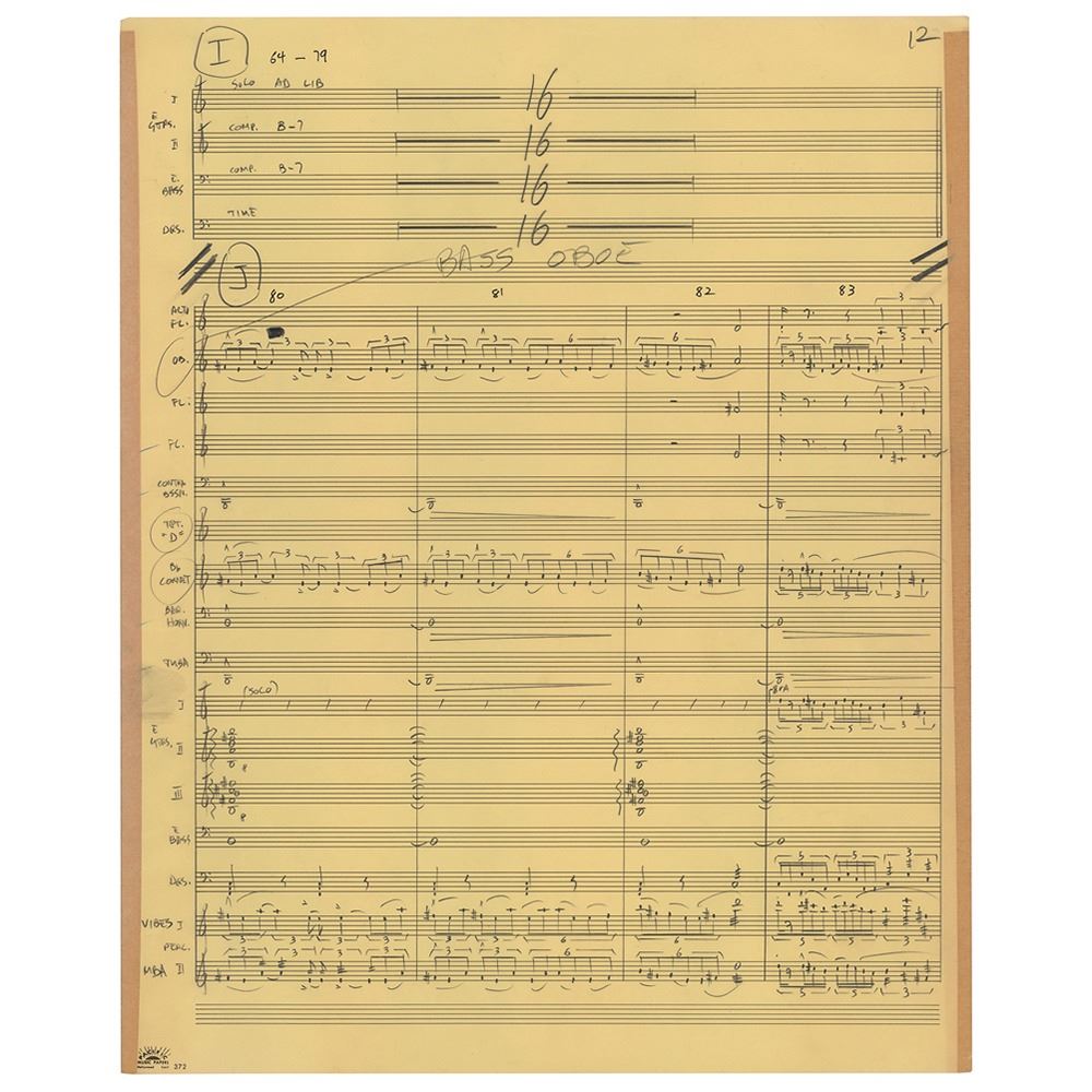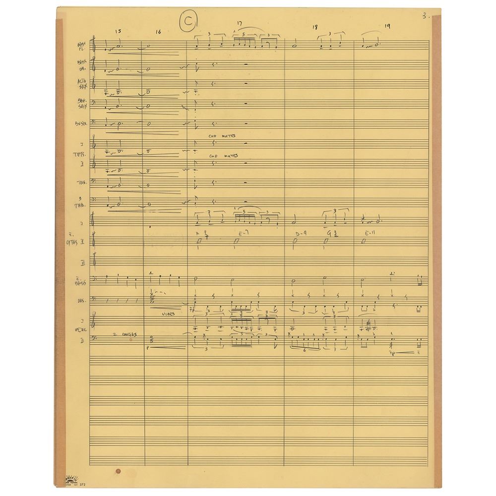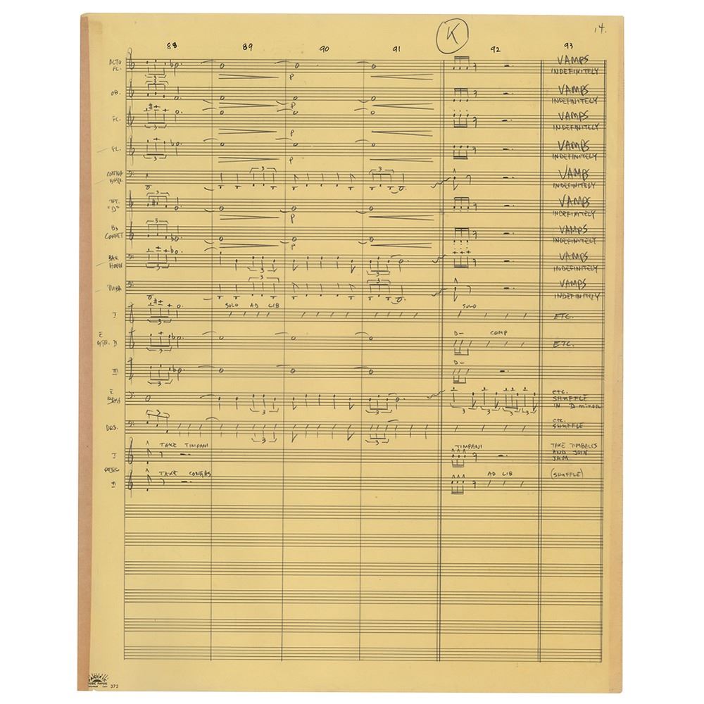 One-of-a-kind original 14-page orchestral arrangement by Frank Zappa for the song ‘Think It Over,’ written as part of the unrealized two-act Broadway stage production Hunchentoot, a science-fiction musical conceived by Zappa while he recovered from his near-fatal attack at the Rainbow Theatre in December 1971. The tape-bound manuscript, 12.25 x 15, is comprised of 14 musically lined sheets that are meticulously and entirely annotated in pencil by Zappa, who incorporates his signature on the cover sheet: “‘Think It Over,’ Part I, Frank Zappa, Concert Pitch Score, Don’t Shoot This Page.â€