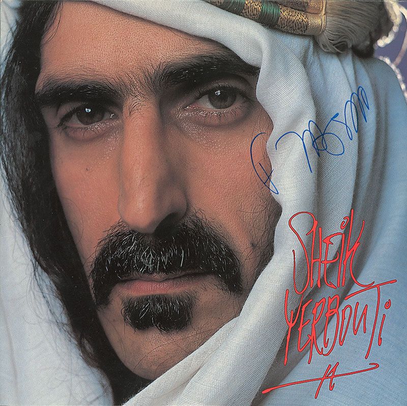 Sheik Yerbouti album signed on the front cover in blue felt tip, “F. Zappa.” In fine condition. The records are included. Accompanied by a copy of a photo taken at the time of signing.