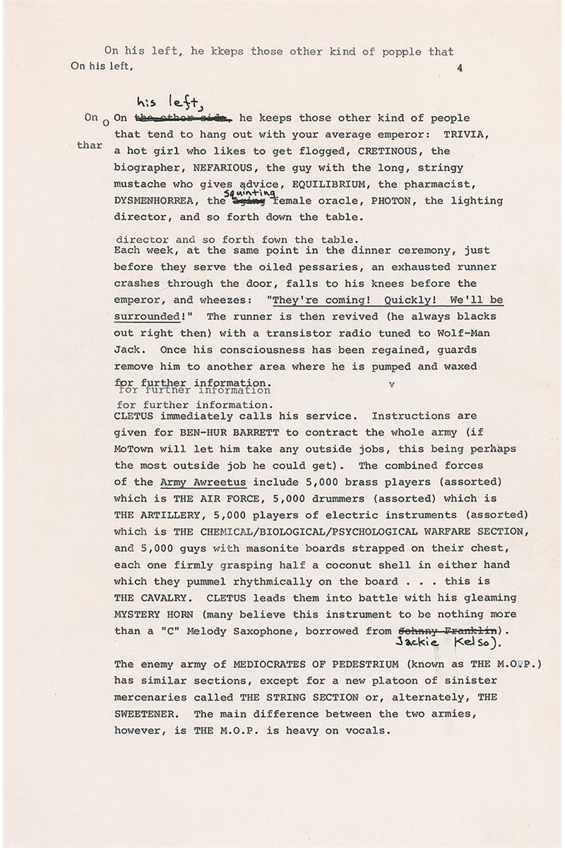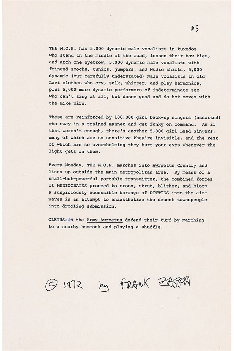 Two original typed pages for the Grand Wazoo story, both 8.5 x 13, signed on page five “© 1972 by Frank Zappa.” Zappa has made three corrections to the story on the first page, crossing out the typed text and writing, “his left,” “Squinting,” and “Jackie Kelso,” as the corrections. Accompanied by an original 1972 five-page photocopy of the entire story, which appeared inside the gatefold cover of the album. In fine condition, with a light central vertical fold to the typed pages.