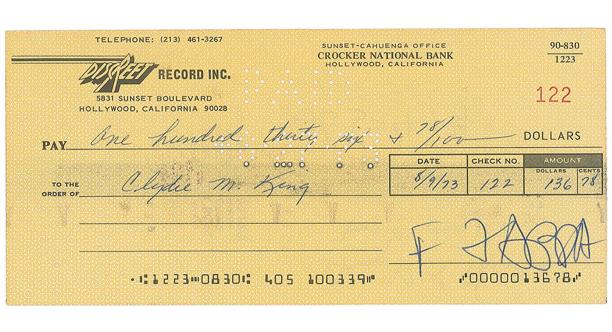 Discreet Record Inc. business check, 7.25 x 3.25, filled out in another hand and signed by Zappa, “F. Zappa,” payable to Clydie M. King for $136.78, August 9, 1973. In fine condition, with expected holes and some light show-through from ink strip on reverse.