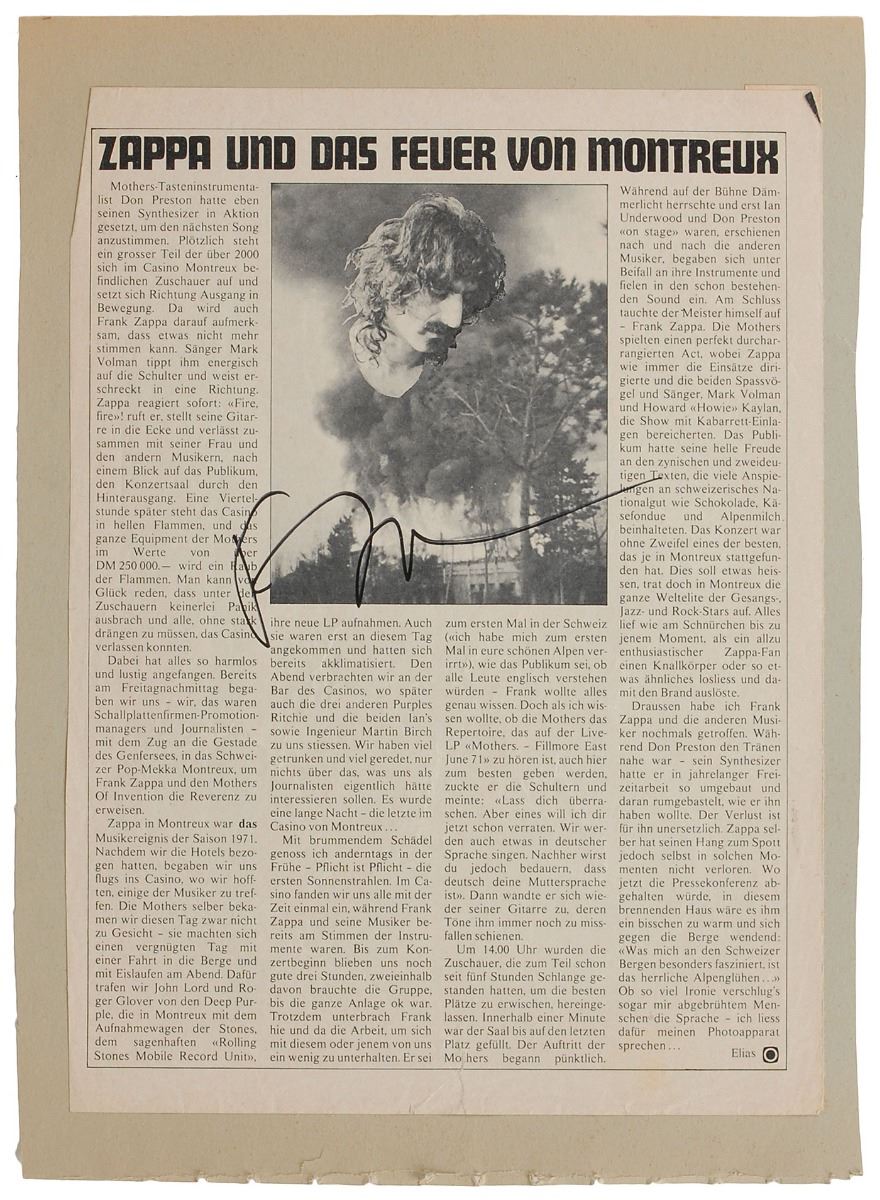 Two German magazine pages: a color 10 x 12 photo of Zappa smoking a cigarette, signed in black felt tip; and an 8 x 11 magazine article featuring a smaller image, also signed in black felt tip. Both affixed to slightly larger scrapbook pages. In overall fine condition, with some wrinkling and handling wear, and creasing to the top of the larger photo. Consignor notes that these vintage signatures were obtained in person in Vienna during the early to mid-1970s.