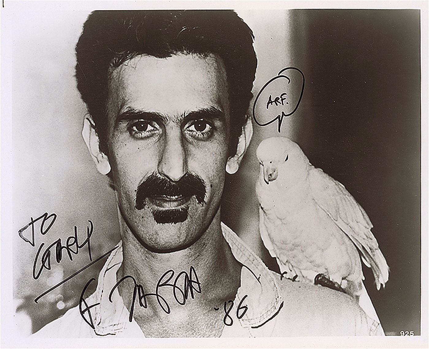 Glossy 9.75 x 8 photo of Zappa with a parrot perched on his shoulder, signed and inscribed in black felt tip, "To Gary, F. Zappa, '86," with the playful addition of a cartoon speech bubble above the bird with the word, "Arf." In fine condition, with a paperclip impression toward the top edge.