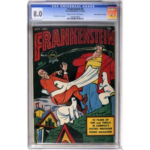 <B>Frankenstein Comics #5 Davis Crippen ("D" Copy) pedigree (Prize, 1946) CGC VF 8.0 Cream to off-white pages.</B></I> Dick Briefer cover and art. Overstreet 2007 VF 8.0 value = $250. CGC census 6/07: 1 in 8.0, 1 higher.<BR><BR><b>Shipping:</b> Comics - Slabbed (certified) (<a target="_blank" href="http://www.heritageauctions.com/common/shipping.php">view shipping information</a>)