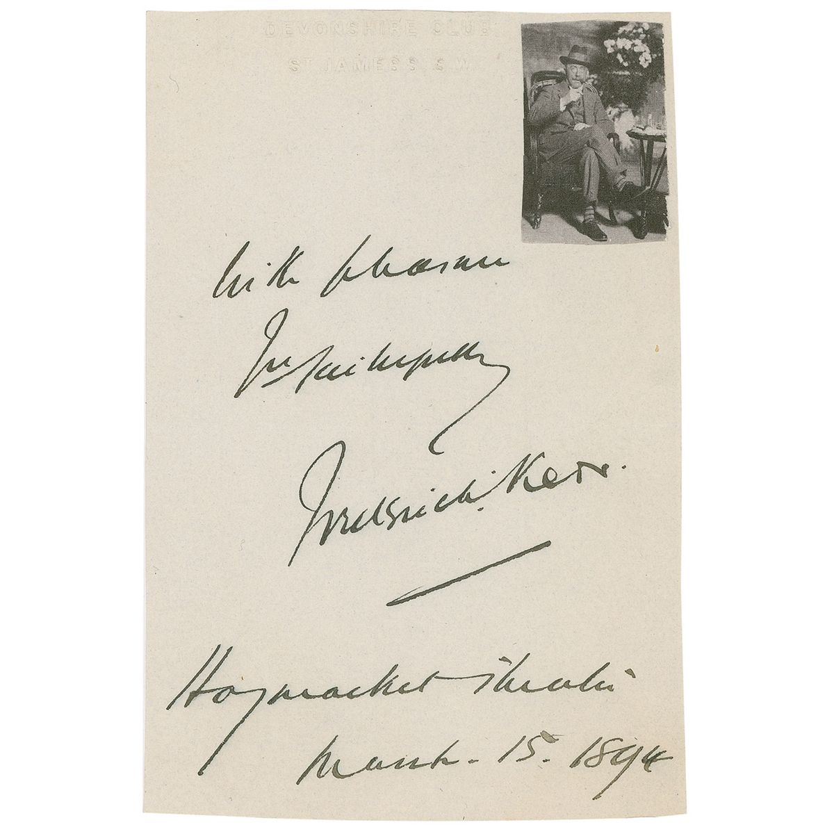 Character actor best remembered for the role of old Baron Frankenstein in James Whale’s 1931 classic, Frankenstein. Scarce vintage ink signature, “With pleasure, Yrs. faithfully, Frederick Kerr, Haymarket Theatre, March 15, 1894,” on an off-white 4 x 6 sheet of trimmed Devonshire Club stationery. In fine condition, with light toning and trimmed edges. A bold and crisp signature tying the elusive actor to a legendary gentlemen‘s club.