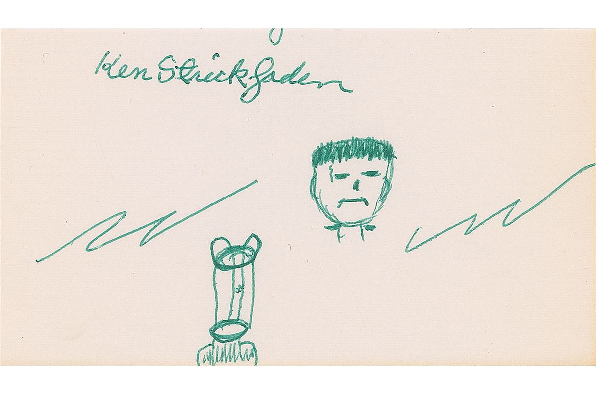 Film set designer and electrical special effects creator (1896–1984) known for his work on Frankenstein and Wizard of Oz. Desirable green ballpoint sketch of Frankenstein’s monster on an off-white 4.75 x 2.75 slip, signed at the top, “Ken Strickfaden.” In fine condition, with trimmed edges.