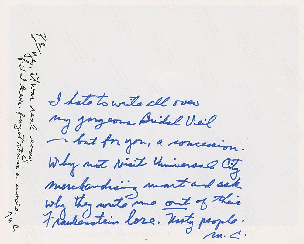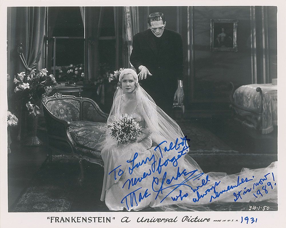 Glossy 10 x 8 photo, signed and inscribed in blue felt tip “To Larry Talbot, never forget, Mae Clarke, who will always remember. It is now 1989!” On the reverse, Clarke adds, “I hate to write all over my gorgeous Bridal Veil—but for you, a concession. Why not visit Universal City merchandising mart and ask why they write me out of their Frankenstein lore. Nasty people. M. C. PS. Yes it was real scary but I never forgot it was a movie. MC.” In fine condition.