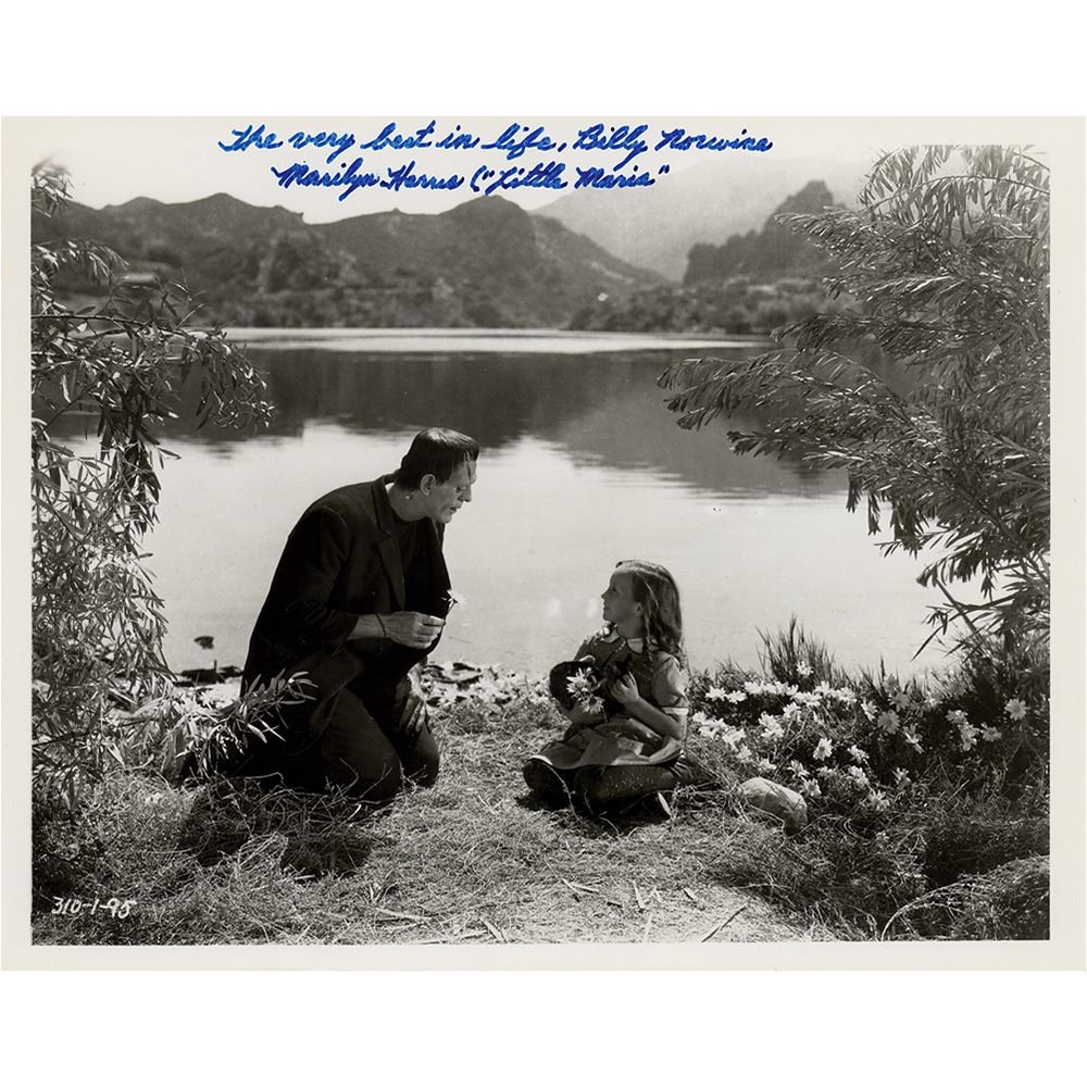 Glossy 10 x 8 photo of 'Little Maria' with the monster in the classic 1931 horror film Frankenstein, signed and inscribed in blue felt tip, "The very best in life, Billy Norwine, Marilyn Harris ('Little Maria')." In very fine condition.