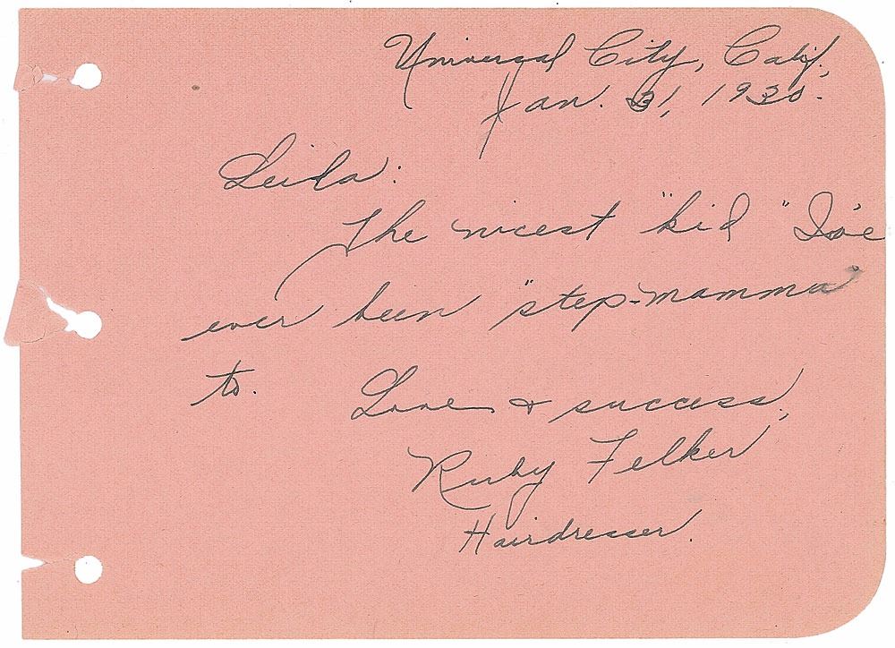 Hollywood hairdresser (1902–1986) who helped Jack Pierce with horror makeup and wigs. Scarce vintage fountain pen signature and inscription, “Universal City, Calif., Jan. 31, 1930, Leila: The nicest ‘kid’ I’ve ever been ‘step-mamma’ to: Love & success, Ruby Felker, Hairdresser,” on a pink 6 x 4.25 album page. In fine condition.