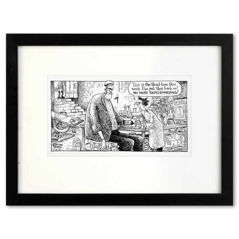 Enter a surreal and satirical world of twisted imagination and award winning creativity. "Frankenstein Skateboarding" is an original pen & ink drawing on paper by Dan Piraro, creator of the critically acclaimed and award winning comic strip, Bizarro. This piece is hand signed, comes custom framed and includes a letter of authenticity. Measures approximately 14" x 21" (frame), 7" x 13" (image).This item requires special handling and may have a longer than usual turnaround.