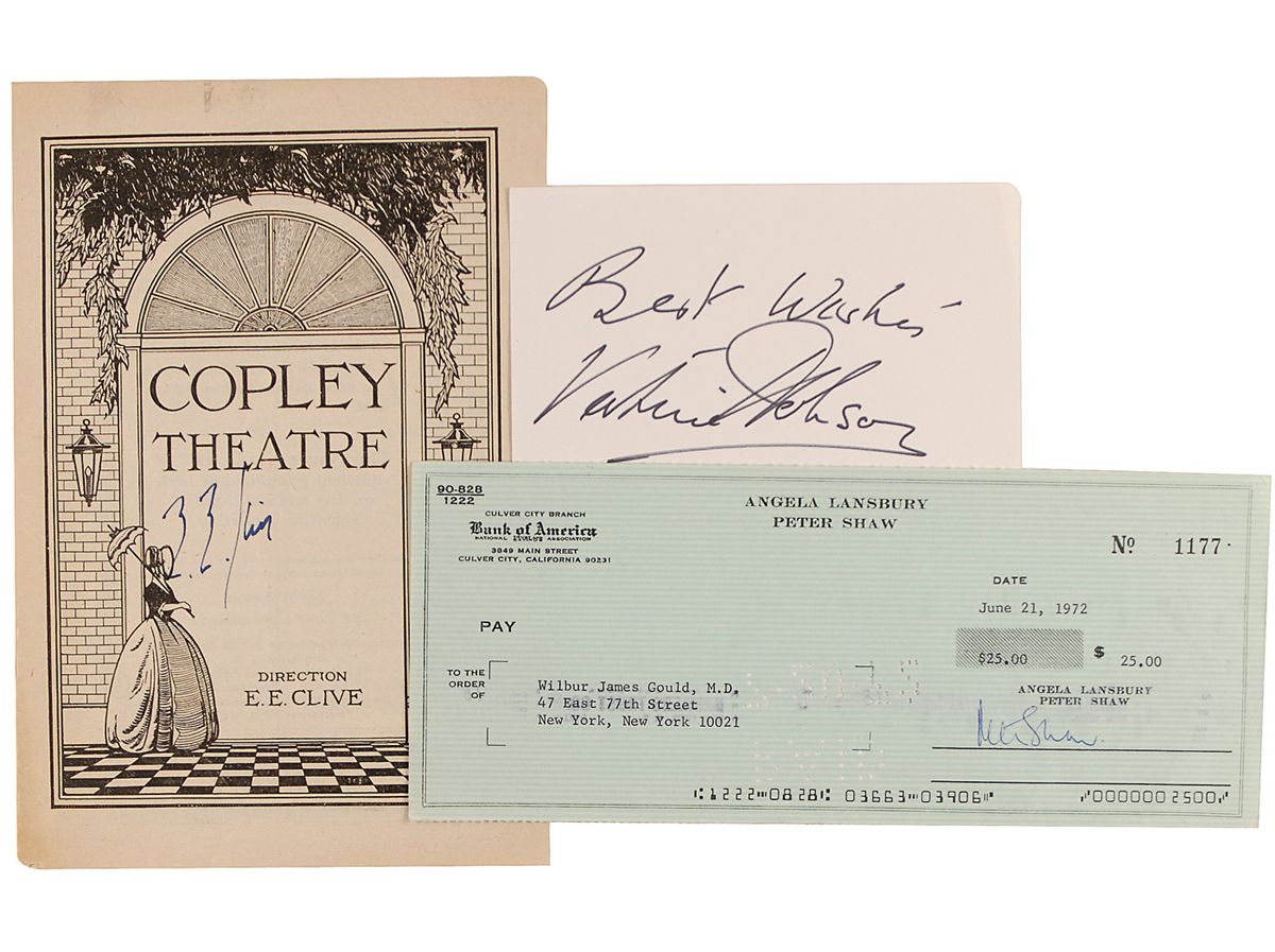 Three items: a 1925 Copley Theatre, Boston program signed in blue ink by E. E. Clive, who played the burgomeister in Bride of Frankenstein; Peter Shaw & Angela Lansbury personal check, 8.5 x 3.5, filled out in type and signed, “Peter Shaw,” payable to Wilbur James Gould for $25.00, June 21, 1972; and a black felt tip signature, “Best wishes, Valerie Hobson,” on an off-white 5 x 3 card. In fine condition, with a central fold and scattered creasing to the program, and expected cancellation holes and stamps to the check. Accompanied by three unsigned cardstock photos of the actors in their roles.