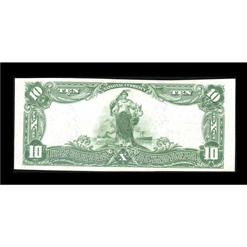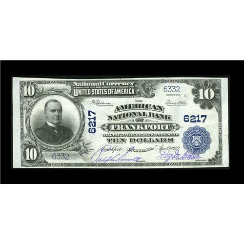 <B>Frankfort, IN</B></I> - $10 1902 Plain Back Fr. 635 <B>The American NB</B></I> Ch. # 6217<BR>This <B>Extremely Fine</B></I> note with strongly legible purple stamped signatures is only the sixth $10 Plain Back to surface from here and the nicest of any listed in the census by a considerable margin. When this bank failed in 1931 the community was left without an issuing institution.