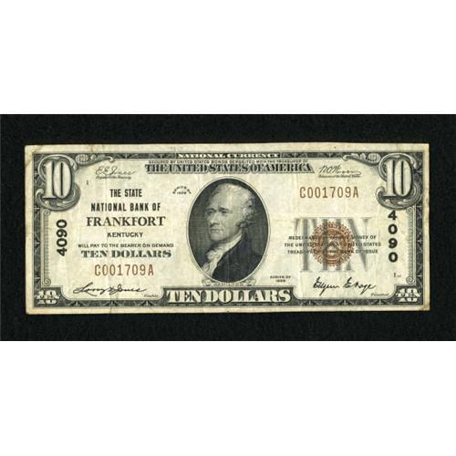 <B>Frankfort, KY</B></I> - $10 1929 Ty. 1 <B>The State NB</B></I> Ch. # 4090<BR> An attractive mid-grade note. Only about two dozen small size notes are known from this Franklin County bank. <B>Very Fine.</B></I><BR><BR><b>Shipping:</b> Coins & Currency (<a target="_blank" href="http://www.heritageauctions.com/common/shipping.php">view shipping information</a>)
