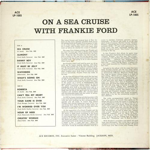 <B>Frankie Ford "Let's Take A Sea Cruise" LP Ace 1005 (1959).</B></I> Ford's first release for the famed Ace label went nowhere in 1958, but the following year "Sea Cruise" made him a household name for generations of Rock. It peaked at a respectable #14 on the Hot 100, but has demonstrated more staying power that hundreds of singles that went even higher. Ford's only Ace album was issued to capitalize on that popularity, but it also includes "Alimony," which charted briefly in 1959. Think the New Orleans cats didn't collaborate? Eleven of the 12 songs here were written or co-written (often with each other) by Ford, Huey Smith, and a very young Mac Rebennack (Dr. John)! Condition: EX 7/ EX 7.