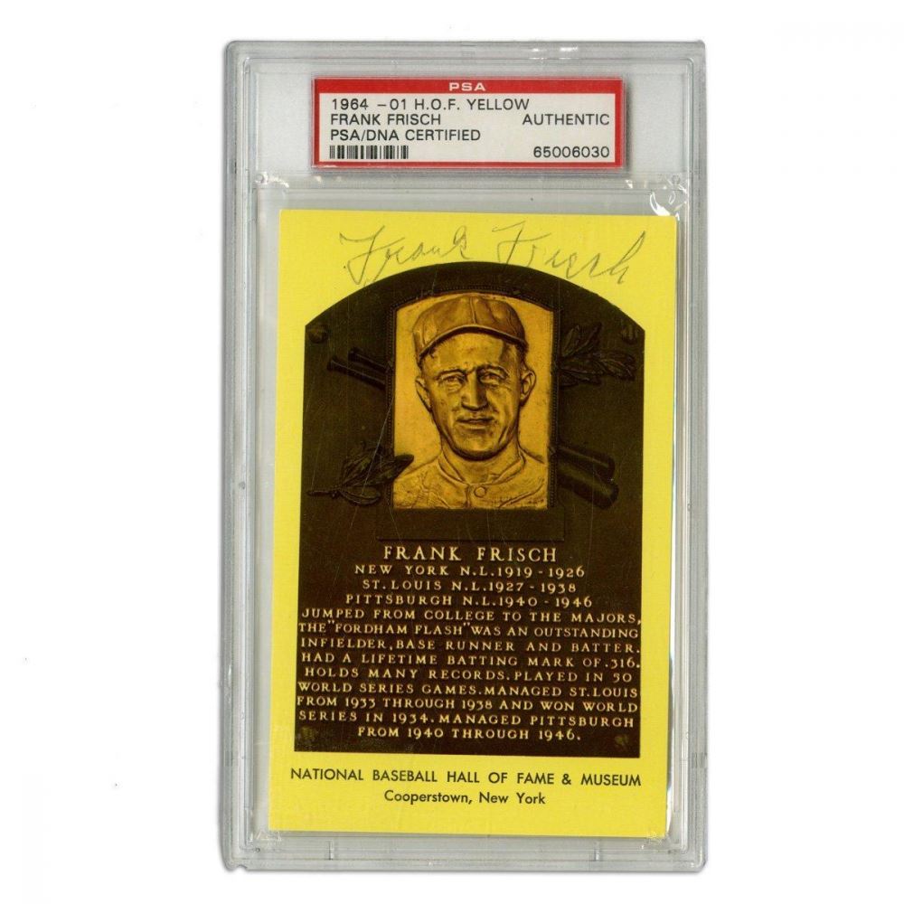 Gold Hall of Fame postcard has been hand-signed in black ink pen by Frankie Frisch (D. 1973, Giants, Cardinals HOF).