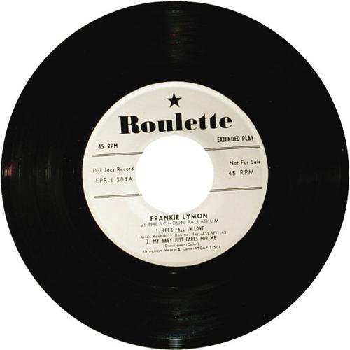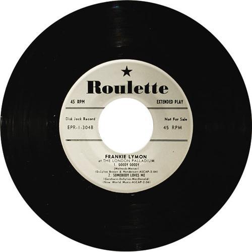 <B>Frankie Lymon At the London Paladium Promo EP Roulette 304 Mono (1958).</B></I> White label promo of EP that includes "Goody Goody", "Let's Fall in Love", "My Baby Just Cares For Me", and "Somebody Loves Me". Condition: EX 7/ MT 9. <I>From the GRT Collection</B></I>.<BR><BR><b>Shipping:</b> Recording (<a target="_blank" href="http://www.heritageauctions.com/common/shipping.php">view shipping information</a>)