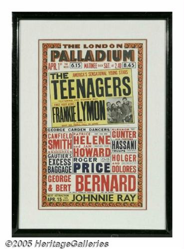<B>Frankie Lymon Poster.</B></I> Though only together for a brief 18-month period, Frankie Lymon & The Teenagers exerted an enormous influence, spawning a wave of "kid" vocal groups and providing Berry Gordy with a model for his Motown sound. Lead singer Frankie Lymon's wise-beyond-his-years vocal abilities made the Teenagers a group several notches above the competition. Sadly, the group split at the height of their success, and Lymon died shortly after. Here, a poster for Frankie Lymon & The Teenagers' April 1, 1957, performance at the London Palladium. The poster comes fmatted and is in great condition. VG+.