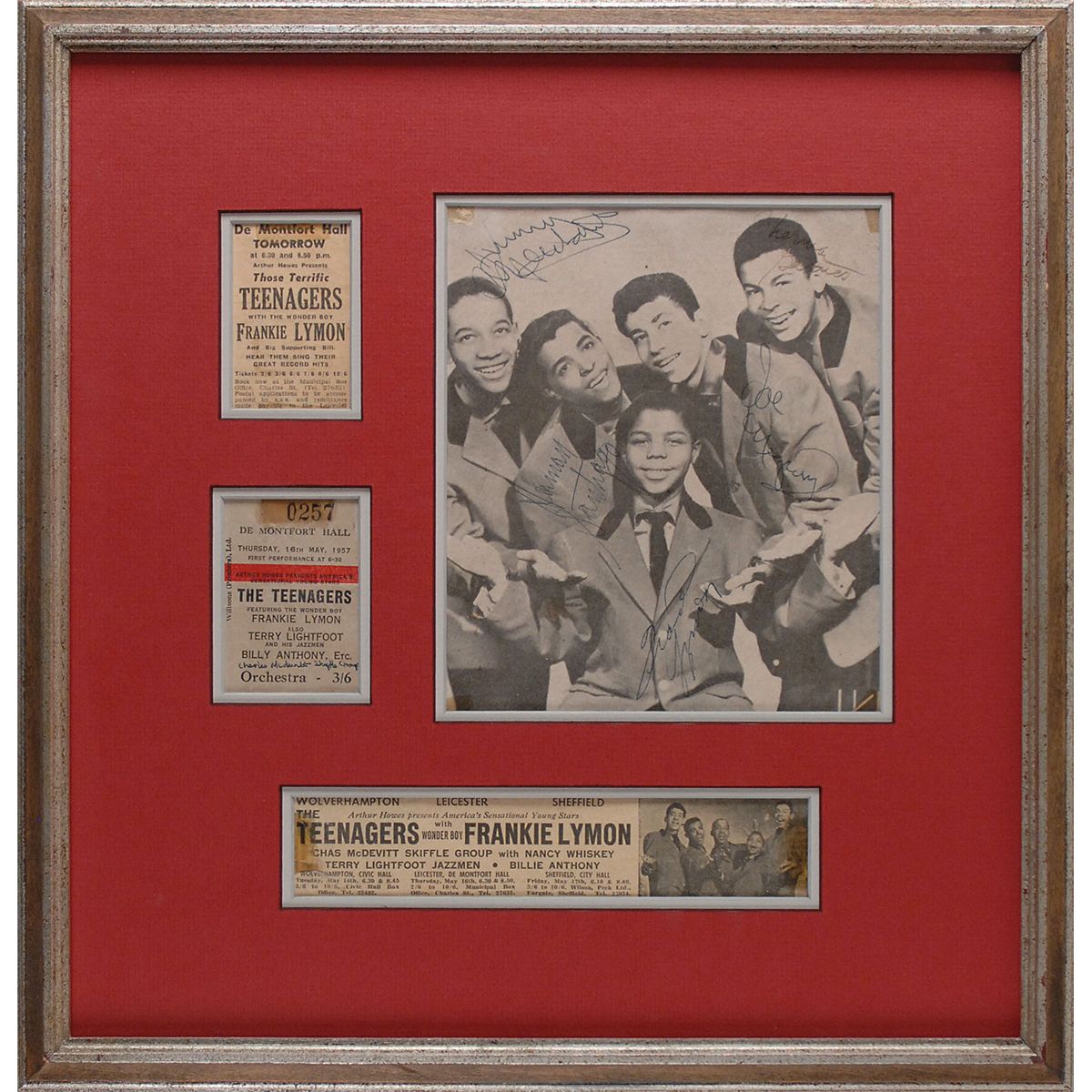 Singing sensation of the 1950s known for ‘Why Do Fools Fall in Love’; Lymon died of a drug overdose at age 25. Vintage 6 x 7 magazine photo of the group, signed in blue and black ink by Frankie Lymon, Herman Santiago, Joe Negroni, Jimmy Merchant, and Sherman Garnes. Double-matted and framed with three small newspaper clippings to an overall size of 15 x 15.5. In fine condition, with Garnes’s signature a bit lighter than the others, and small blocks of old tape toning to corners. Accompanied by a full letter of authenticity from Roger Epperson/REAL.