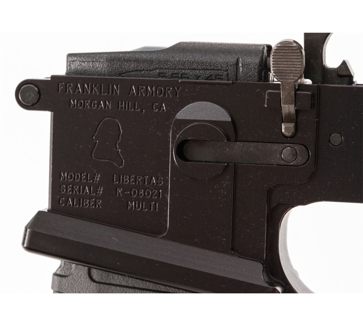 Franklin Armory Libertas Model Semi-Automatic AR-15 Lower Receiver, near complete, #R-08021, matte finish, Ergo grips, 10-round magazine, spring buffer assembly, internal parts, and bullet button mag release. Condition is excellent, appearing as new and unused. Est.: $250-$400. (Modern) (Field Time)