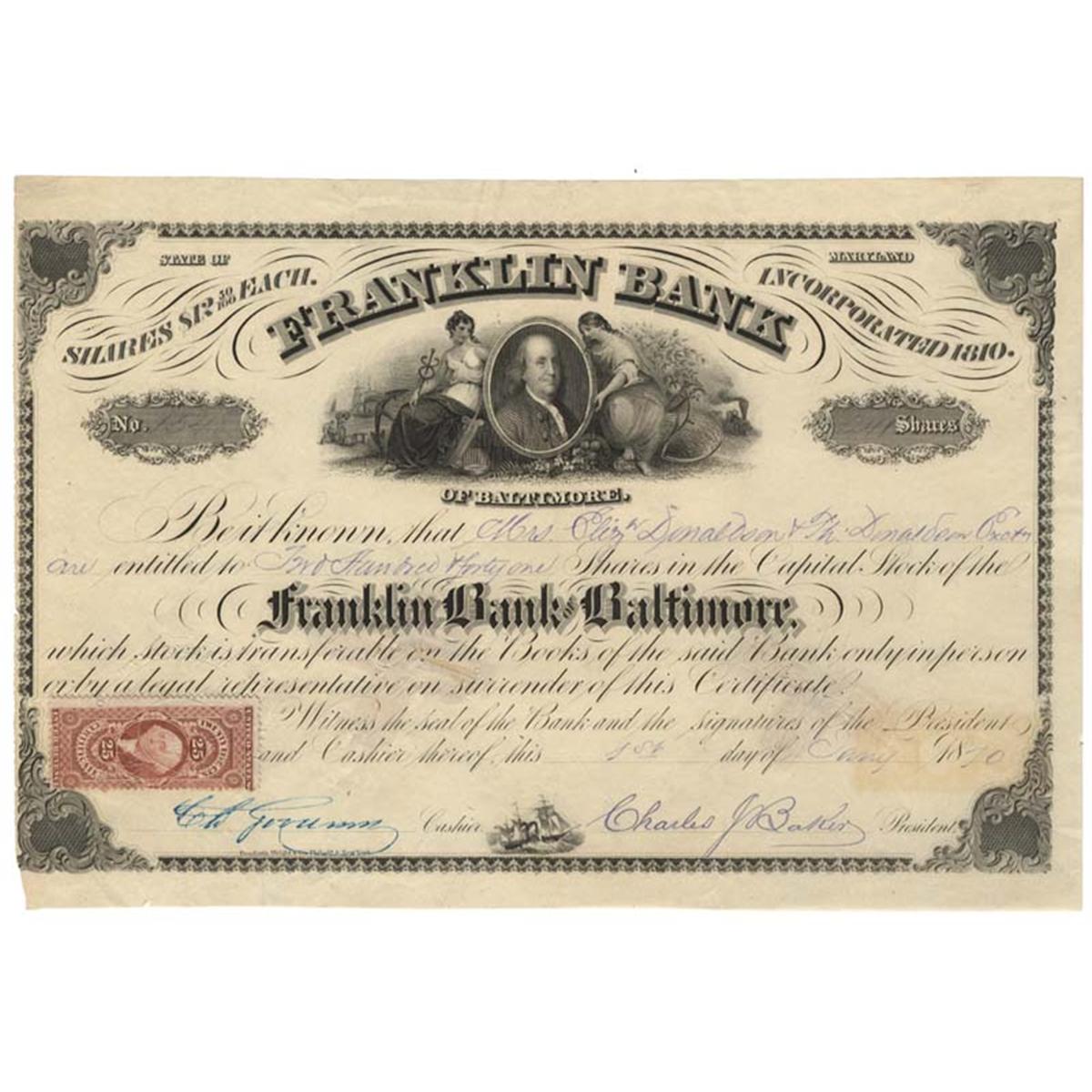 1870, Baltimore, Maryland. Stock certificate for 241 shares. Black. Lovely engraved vignette of a portrait of Benjamin Franklin flanked by seated figures. Attached adhesive revenue stamp at lower left. A scare American bank stock and excellent for display. Uncancelled and Extremely Fine.