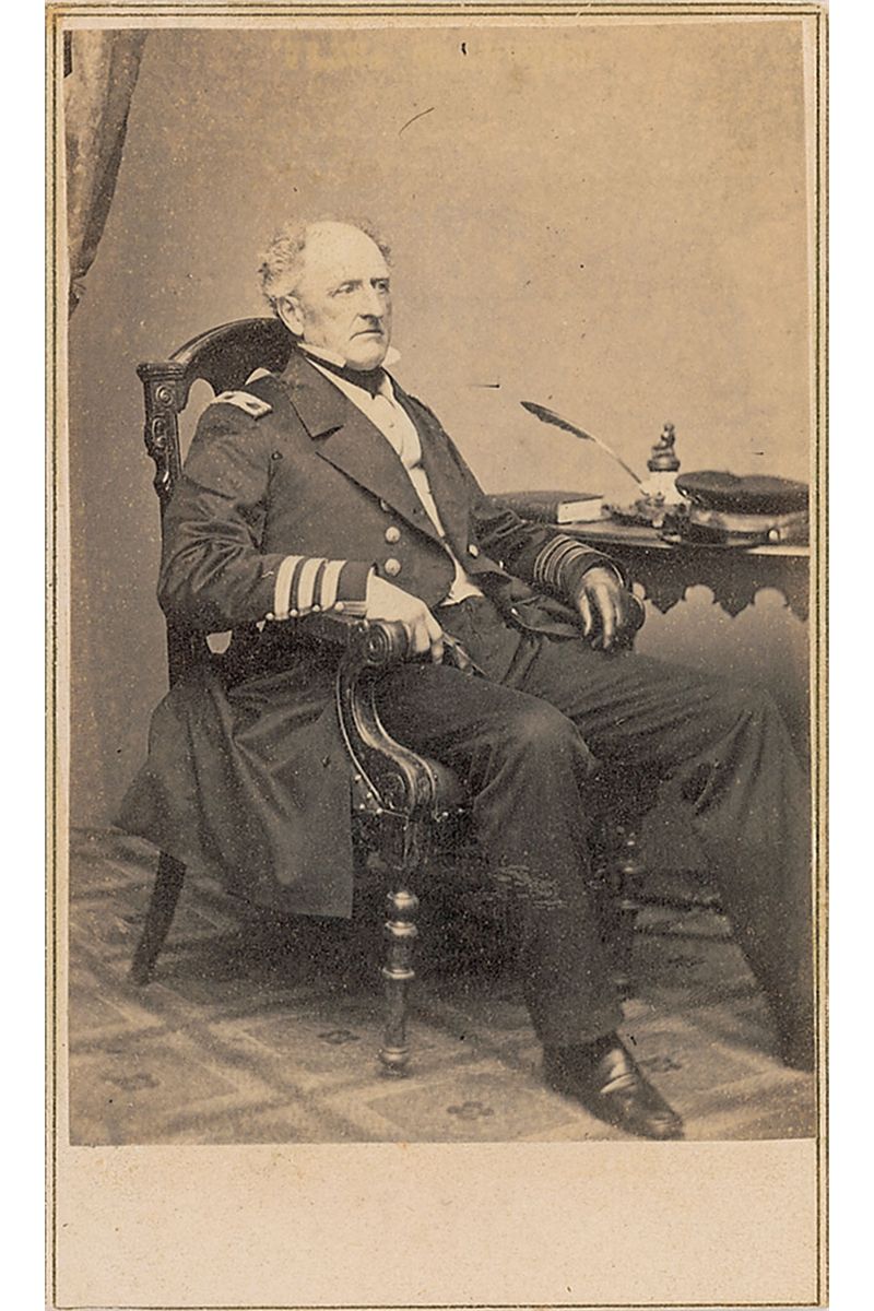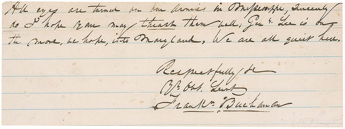 Confederate admiral (1800–1874) who captained the ironclad CSS Virginia during the Civil War. ALS signed “Frank’n Buchanan,” one page, lightly-lined, 7.5 x 2.75, no date. Partial letter regarding tactical movement. In full: “All eyes are turned on our Armies in Mississippi, sincerely do I hope you may thank them well; Gen’l Lee is on the move, we hope, into Maryland. We are all quiet here.” Professionally inlaid into a slightly larger off-white sheet. In fine condition. Accompanied by an unsigned original carte-de-visite portrait of Buchanan.