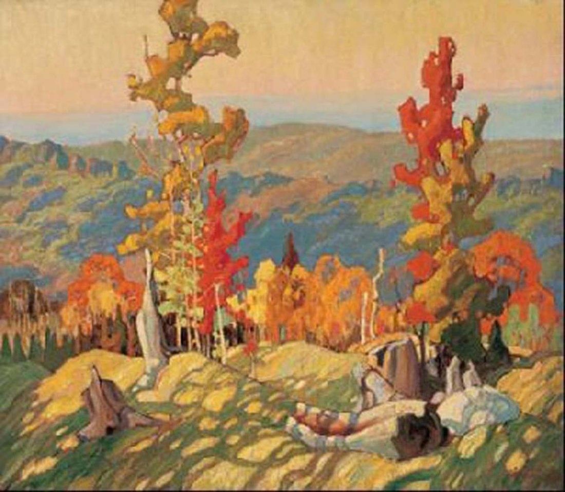 Franklin Carmichael's "Autumn in Northland" giclee canvas reproduction. This canvas is in mint condition, comes gallery wrapped, and has never been framed. Image- 37" x 48".