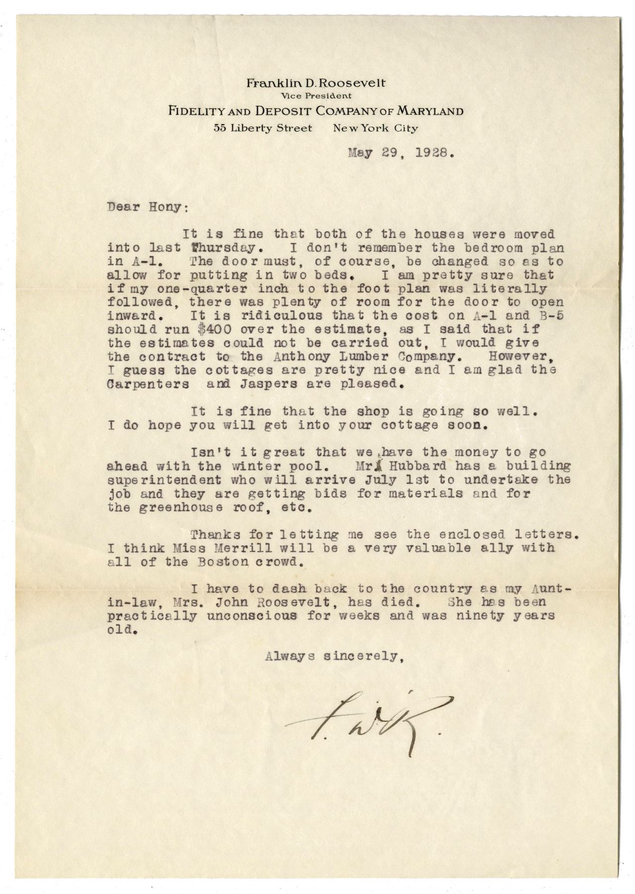Franklin D. Roosevelt typed letter signed ''F.D.R.'', dated 29 May 1928 regarding the polio treatment center at Warm Springs, with highly detailed content showing his involvement in running the center. Roosevelt writes to his physical therapist Helena Mahoney, who developed the treatment protocol at Warm Springs alongside Dr. Leroy Hubbard. On Roosevelt's custom business stationery, letter reads in part, ''...It is fine that both of the houses were moved into last Thursday. I don't remember the bedroom plan in A-1. The door must, of course, be changed so as to allow for putting in two beds. I am pretty sure that if my one-quarter inch to the foot plan was literally followed, there was plenty of room for the door to open inward. It is ridiculous that the cost on A-1 and B-5 should run $400 over the estimate...It is fine that the shop is going so well...Isn't it great that we have the money to go ahead with the winter pool. Mr. Hubbard has a building superintendent who will arrive July 1st to undertake the job and they are getting bids for materials and for the greenhouse roof, etc. / Thanks for letting me see the enclosed letters. I think Miss Merrill will be a very valuable ally with all of the Boston crowd. / I have to dash back to the country as my Aunt-in-law, Mrs. John Roosevelt, has died. She has been practically unconscious for weeks and was ninety years old...[signed] F.D.R.'' Single page letter measures 7.25'' x 10.5''. Folds and minute creasing, overall near fine.