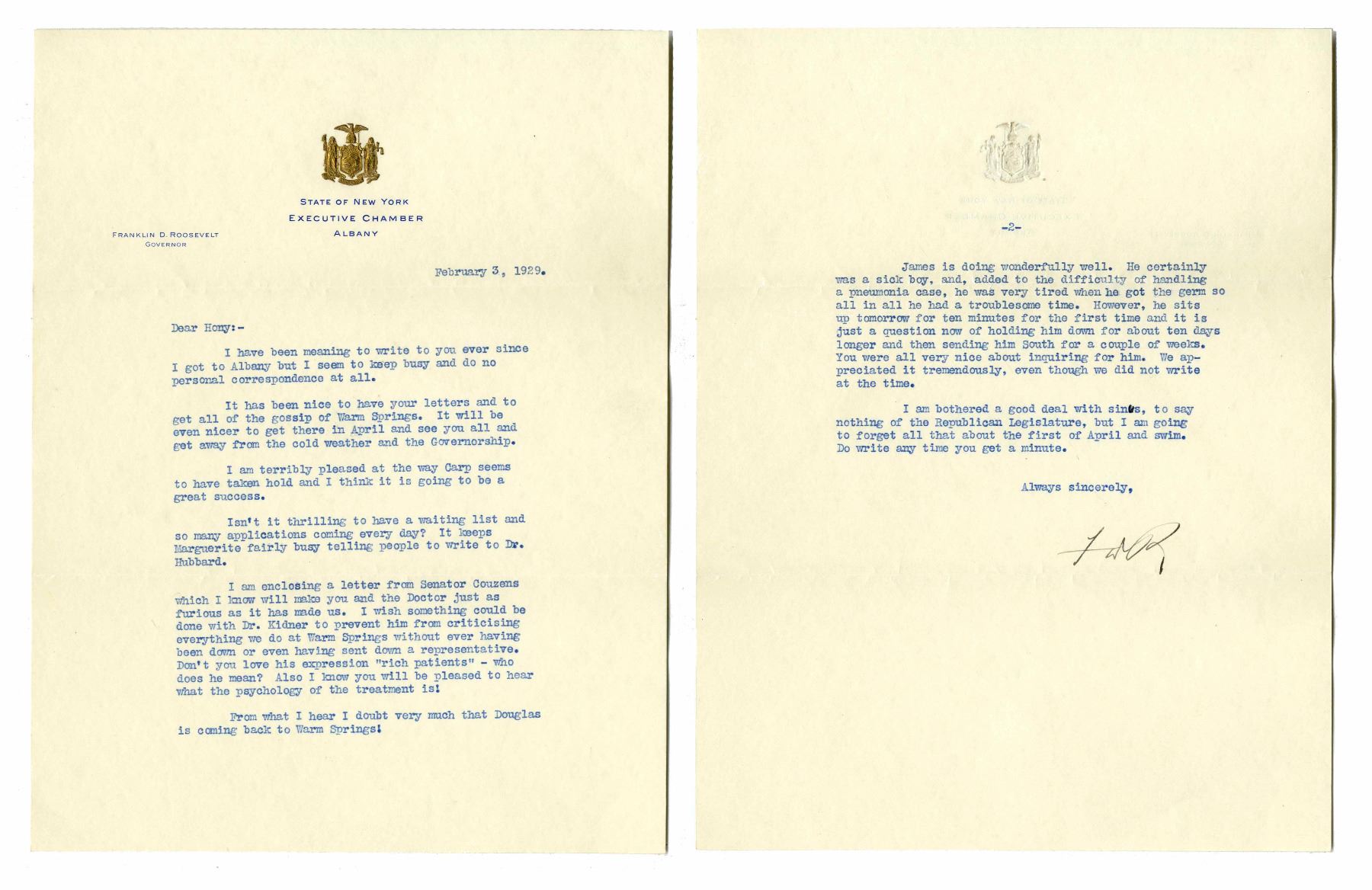 Franklin D. Roosevelt typed letter signed ''FDR'' regarding the polio treatment center at Warm Springs, with personal content regarding its operation and responding to criticism of it. Letter is dated 3 February 1929 on Roosevelt's Gubernatorial stationery during a time of rapid growth for the center, prompting enhanced scrutiny.