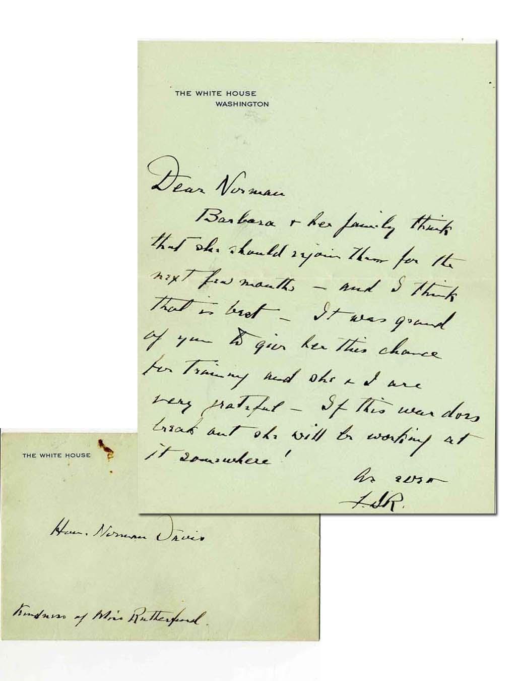 Historically significant autograph letter signed by Franklin D. Roosevelt as President on White House stationery, undated though shortly before the start of WWII. Here, Roosevelt writes Norman Davis, President of the Council on Foreign Relations, regarding a job for Barbara Rutherford, the daughter of Roosevelt's long-standing mistress, Lucy Mercer Rutherford. In full, ''Dear Norman / Barbara and her family think that she should rejoin them for the next few months - and I think that is best - It was good of you to give her this chance for training and she and I are very grateful - if this war does break out she will be working at it somewhere! As ever / F.D.R.'' Extremely rare letter by Roosevelt referencing a relationship between himself and Lucy Rutherford, even rarer still that it dates to at least the late 1930's when Roosevelt and Rutherford's relationship was supposedly dormant. Accompanied by original White House transmittal envelope addressed in Roosevelt's hand, ''Hon. Norman Davis / Kindness of Miss Rutherford.'' Letter, measuring 7'' x 9'', has one fold from mailing, otherwise near fine condition. Housed in an ornate green leather clamshell case.