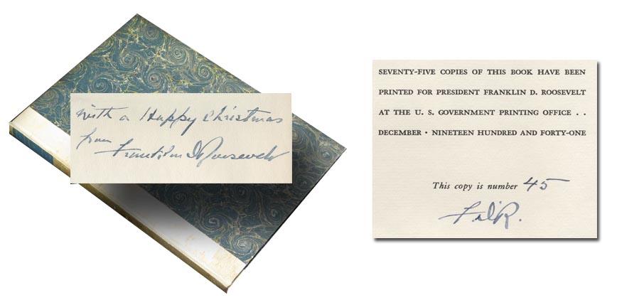 One-of-a-kind book twice-signed by FDR as President, who gave it as a December 1941 White House Christmas gift, just a few weeks after Pearl Harbor. Signed and inscribed on the front free endpaper, ''With a Happy Christmas from Franklin D. Roosevelt''. Entitled ''Addresses of Franklin D. Roosevelt / President of the United States / from January 19, 1940 to January 20, 1941,'' book is one of just 75 copies printed, numbered ''45'' by Roosevelt and signed, ''F.D.R.'' on limitation page. Ten of President Roosevelt's addresses are included, beginning with his 19 July 1940 speech announcing his decision not to run for reelection, in part, ''when the conflict broke out last September, it was still my intention to announce...that under no conditions would I accept reelection.'' FDR changed his mind, after asking himself ''whether I have the right, as Commander-in-Chief of the Army and Navy, to call on men and women to serve their country or to train themselves to serve and, at the same time, decline to serve my country in my own personal capacity, if I am called upon to do so by the people of my country.'' His September 11th speech at Constitution Hall reads in part, ''I hate war, now more than ever. I have one supreme determination to do all that I can to keep war away from these shores for all time.'' His speeches at Boston Garden on 30 October 1940, the Brooklyn Academy of Music on 1 November 1940, Cleveland's Public Auditorium on 2 November 1940 and Hyde Park on Election eve, 4 November 1940, precede his third Inaugural Address on 20 January 1941, the last speech in the book. Half vellum over marble-patterned boards, measures 7'' x 10'' and is in near fine condition. A rare collection personalized by this nation's longest serving President.