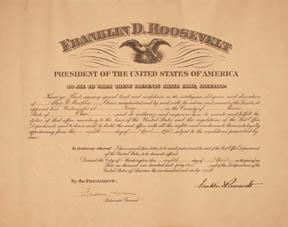 Large document signed by Franklin D. Roosevelt as President, dated 8 April 1942. Here, Roosevelt appoints Algy R. Murphy as Postmaster in Troy, Ohio. Attractive 18'' x 14'' document bears a large engraving of an eagle and the President's name at top. In very good plus condition with light foxing and toning. Features an exceptionally bold full signature by President Roosevelt.