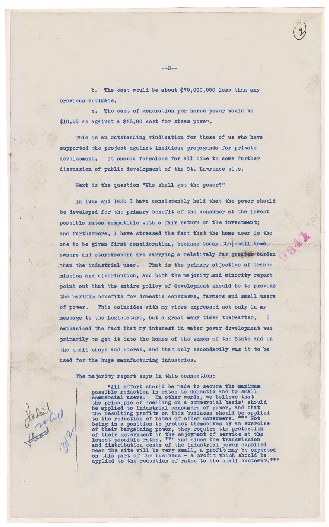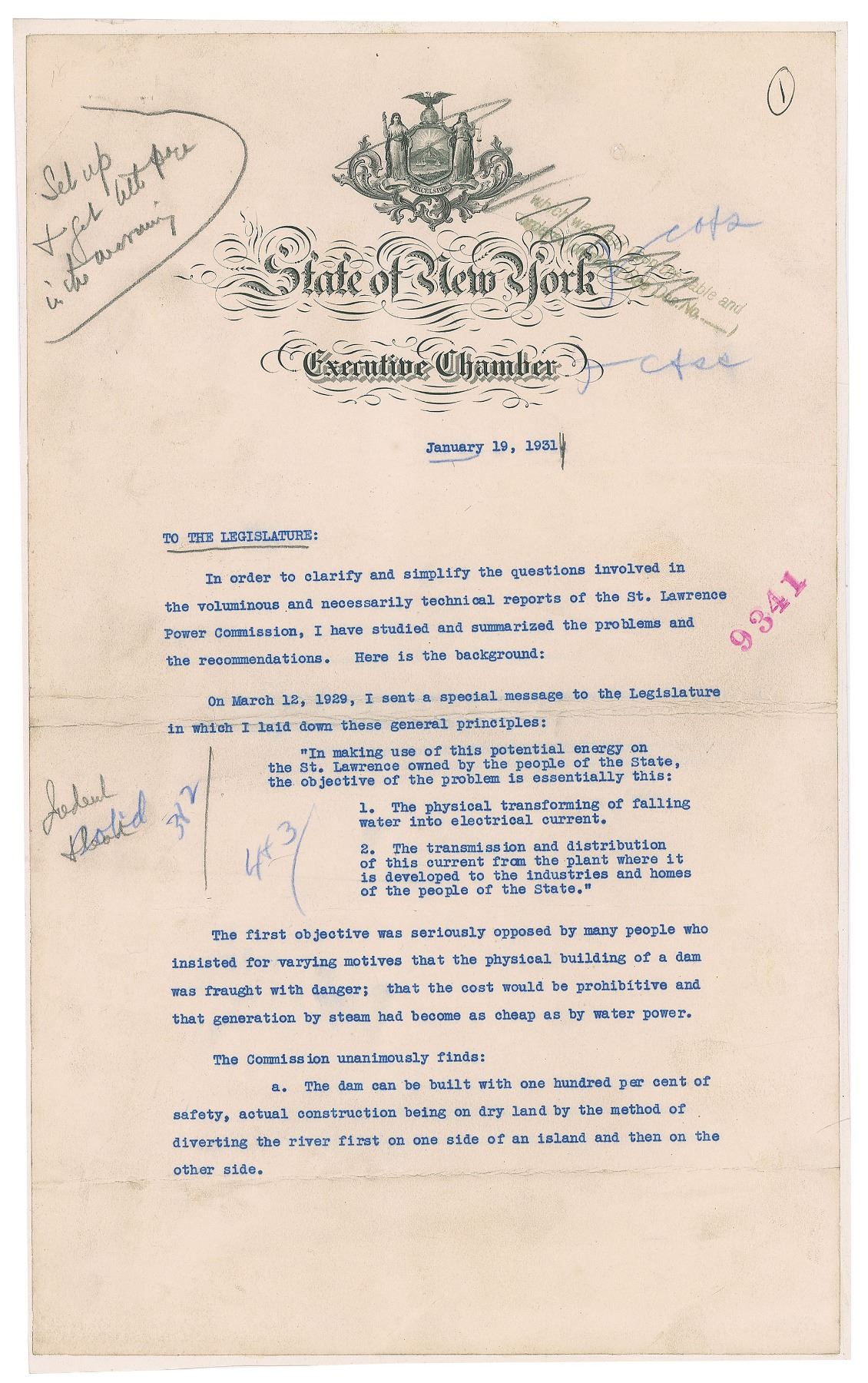 DS, eight pages, 9.75 x 16 (with signed page trimmed to 9.75 x 7), January 19, 1931. As governor of New York, Roosevelt submits to the state legislature a summary of the recommendations of the St. Lawrence Power Commission. He points out that the Commission's finding that a dam can be built safely "is an outstanding vindication for those of us who have supported the project against the insidious propaganda for private development. It should foreclose for all time to come further discussion of public development of the St. Lawrence site."