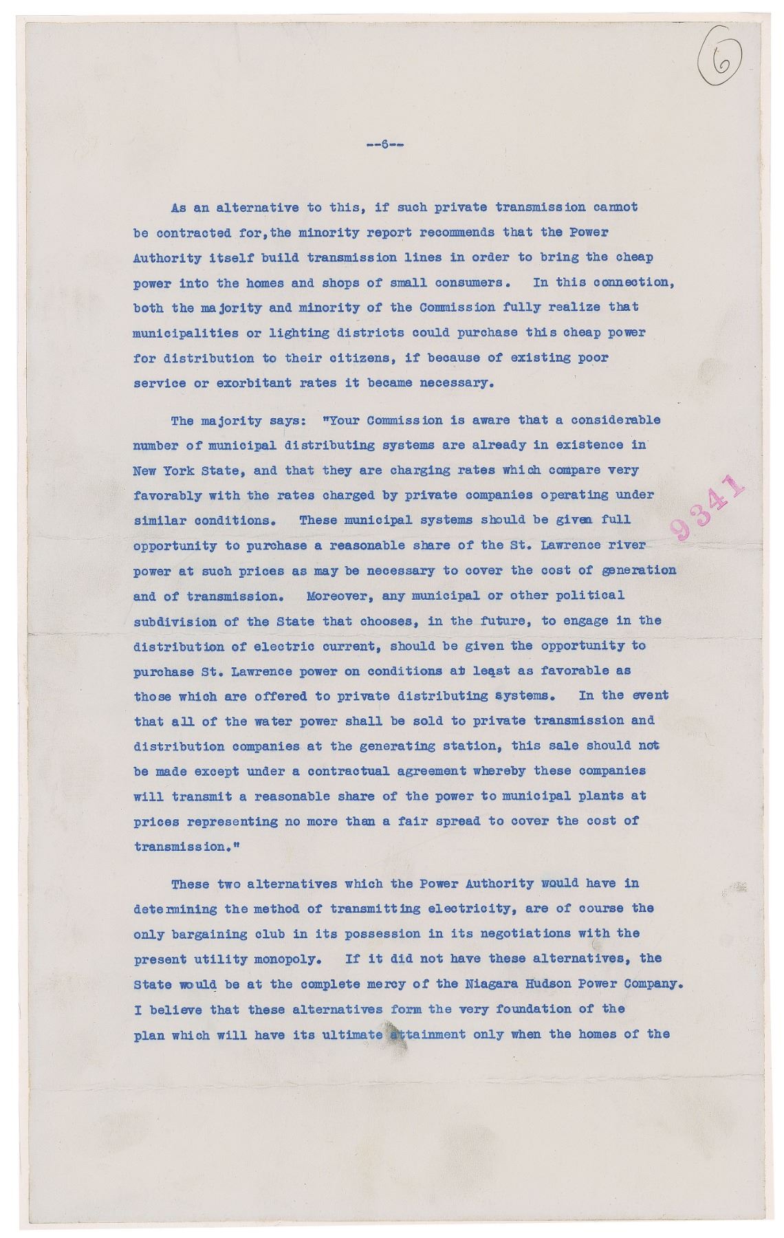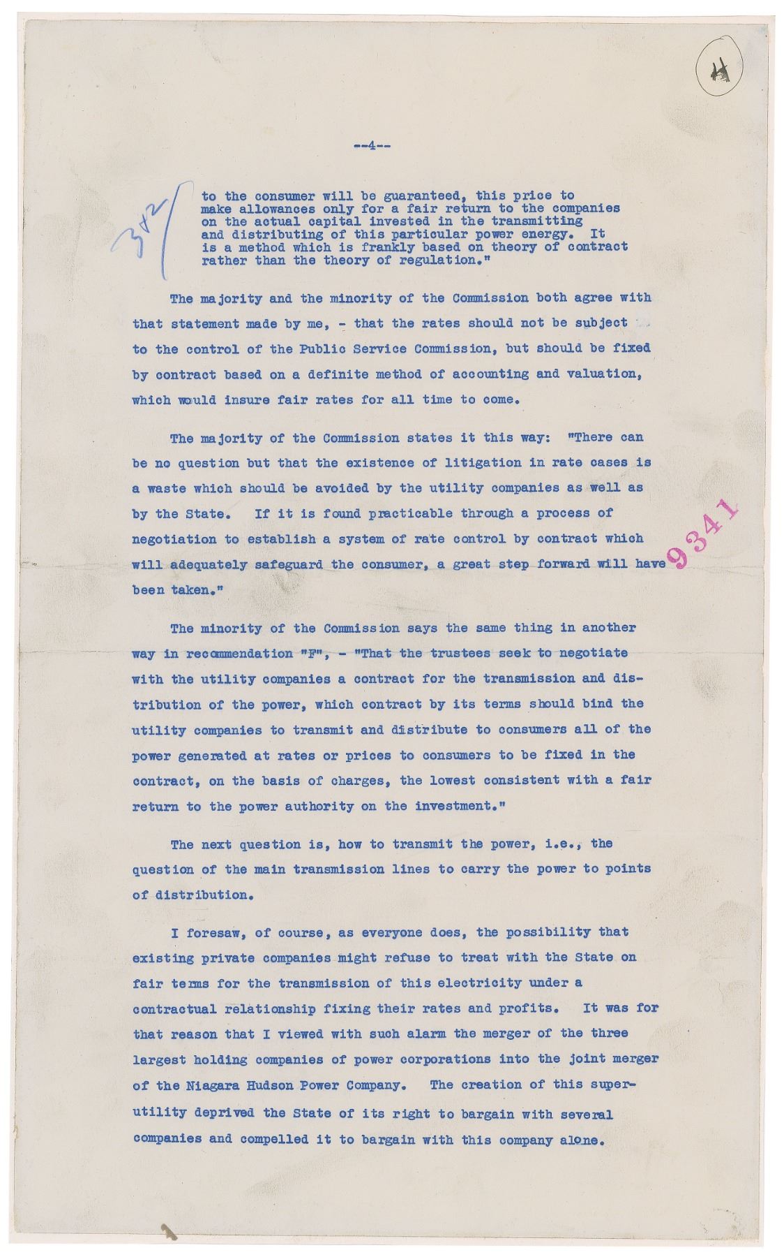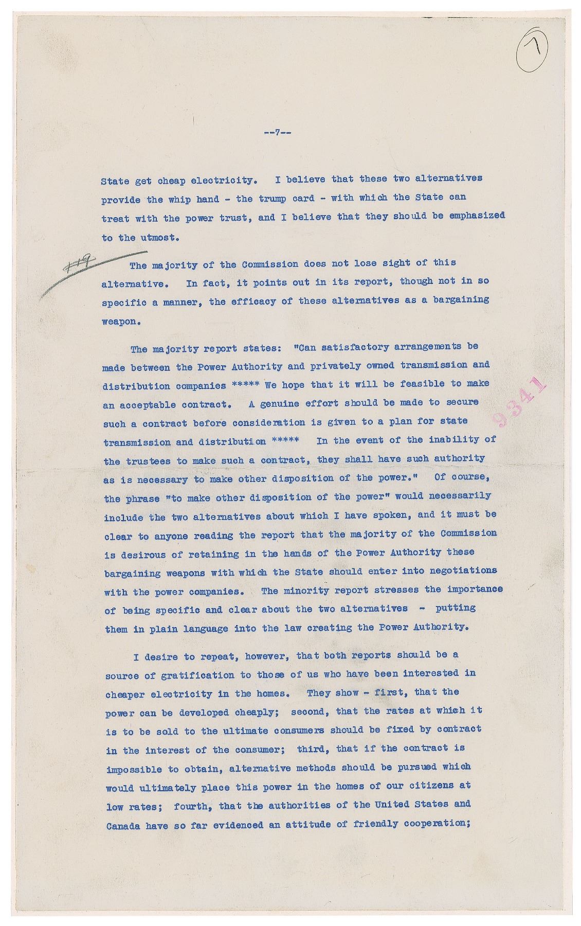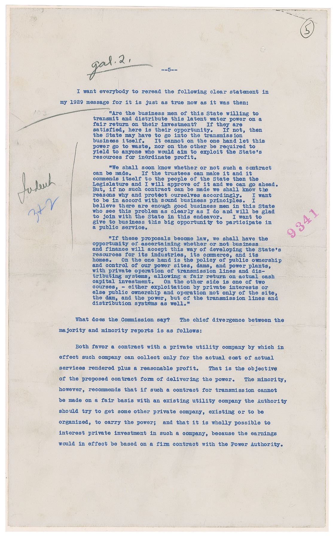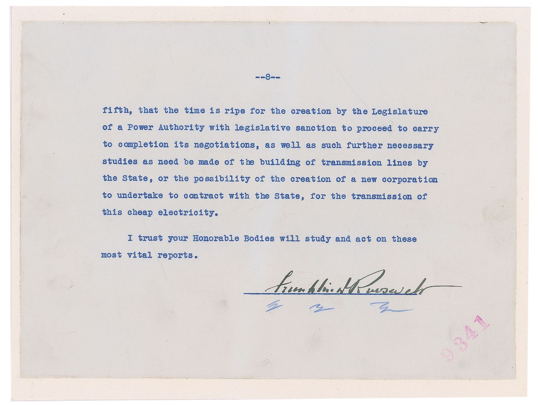 As for the question "Who shall get the power?," Roosevelt points out that the Commission, like himself is "interested chiefly not so much in disposition of this power to industries which might locate near the St. Lawrence River, but in its cheap sale and transmission to household consumers." And the Commission has also reported its agreement with the Governor's position "that the rates should not be subject to the control of the Public Service Commission, but should be fixed by contract based on a definite method for transmittal of power, but the Governor feels that keeping these alternatives as options will be a useful 'bargaining club…' in negotiating with the newly formed private Niagara Hudson Power Company." He concludes by saying that both minority and majority reports "should be a source of gratification to those of us who have been interested in cheaper electricity in the homes. They show—first, that power can be developed cheaply; second, that rates at which it is to be sold to the ultimate consumers should be fixed by contract in the interest of the consumer; third, that if the contract is impossible to obtain, alternate methods should be pursued which would ultimately place this power in our homes of our citizens at low rates; fourth, that the authorities of the United States and Canada have so far evidenced an attitude of friendly cooperation; fifth, that the time is ripe for the creation by the Legislature of a Power Authority with Legislative sanction to proceed to carry to completion its negotiations, as well as such further necessary studies as need be made of the building of transmission lines by the State, or the possibility of a new corporation to undertake to contract with the State, for the transmission of cheap electricity." In fine condition, with some light smudging from pencil notations, and the last (signed) page trimmed in size. From the collection of Malcolm Forbes.
